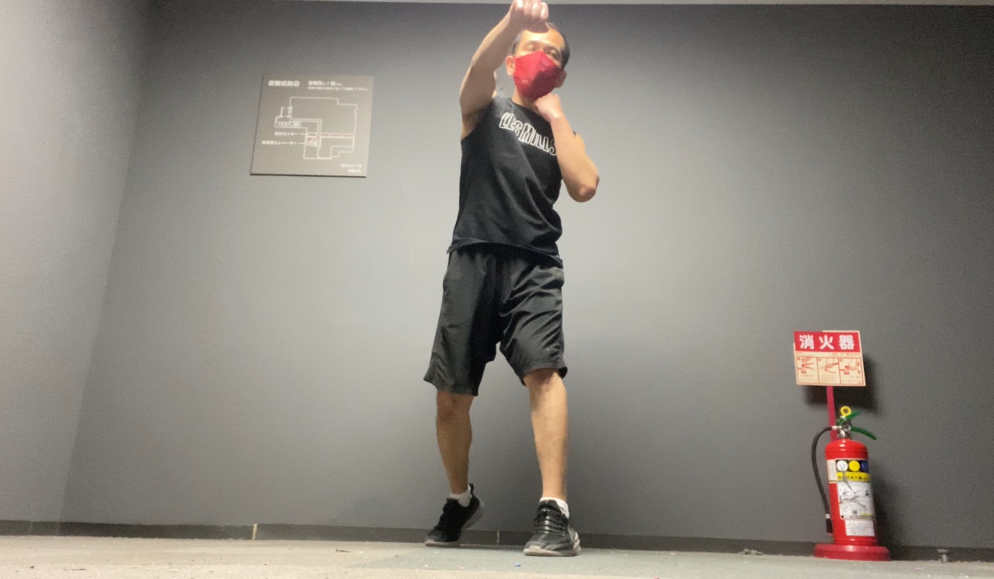 前に移動しながらのジャブ4回は、余裕があればジャンプジャブの要領でやや足を持ち上げながら行います。