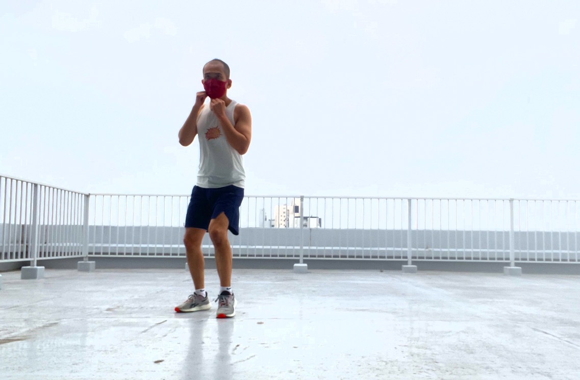 そのステップワークを徐々に「大きく」「ツイスト動作」「フック」を加えたりしながら、運動レベルを上げてきます。