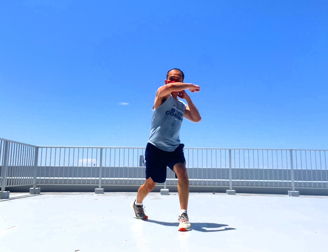 この時、後ろのカカトをしっかり持ち上げて、股関節も一緒にツイスト・捻転させて運動量を上げましょう!