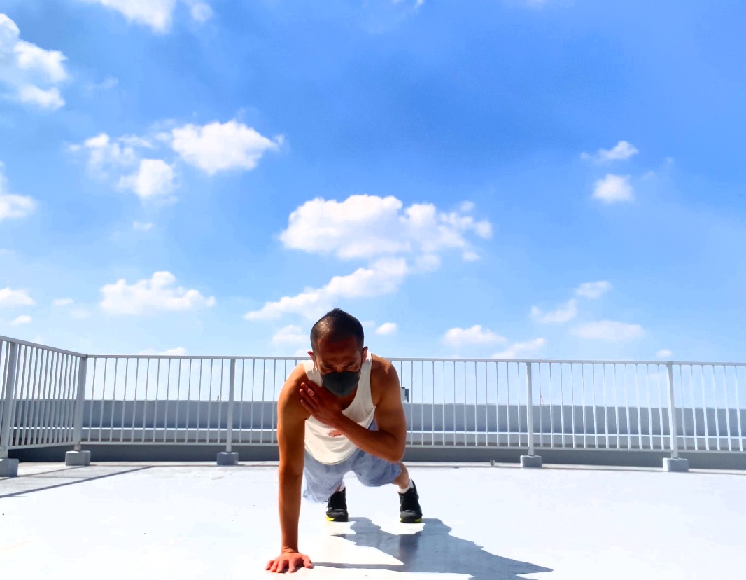 ショルダータップを素早く4回行ったあとに両足を動かすベアクロールの動作。
