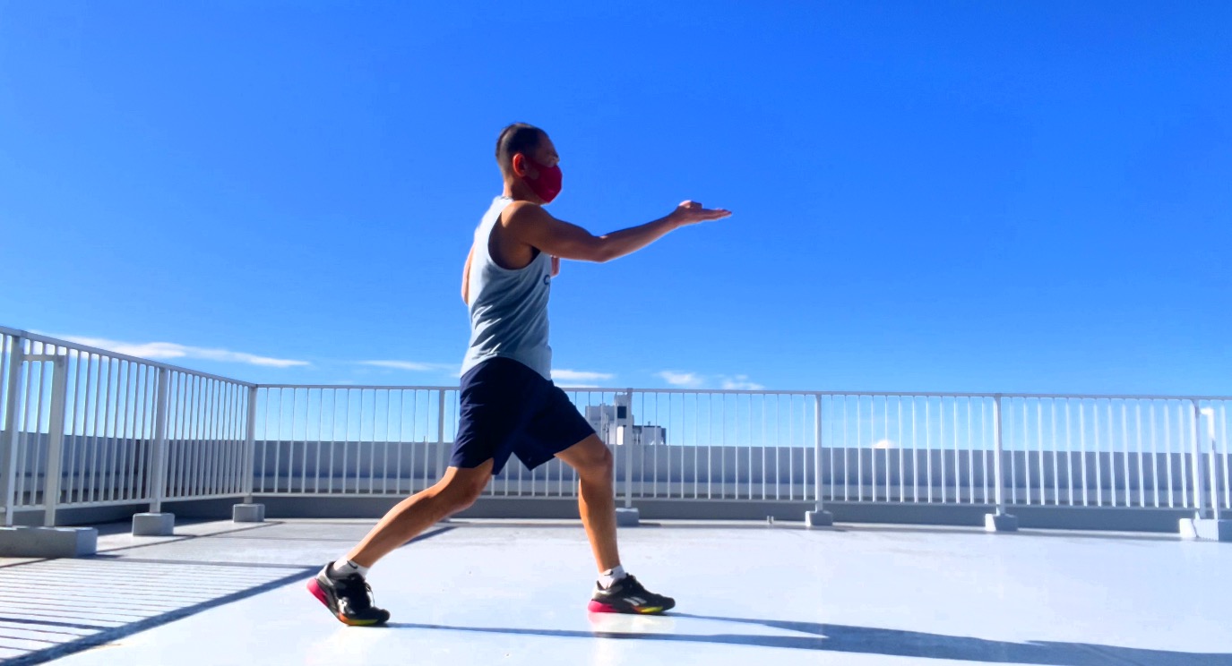 最初はフロントキックのみですが、ナイフストライクを足し、最終形で前に移動しながのコンビネーションになると、フロントキックのプル動作・引く動作の速さがポイントになります。