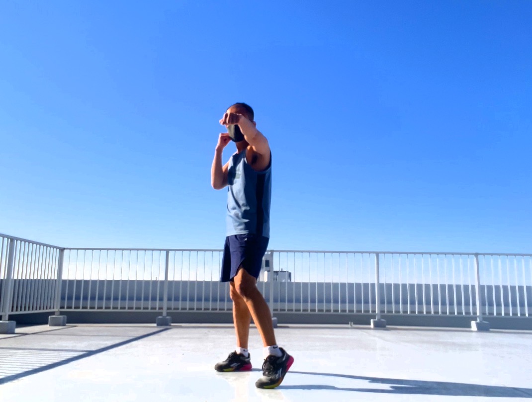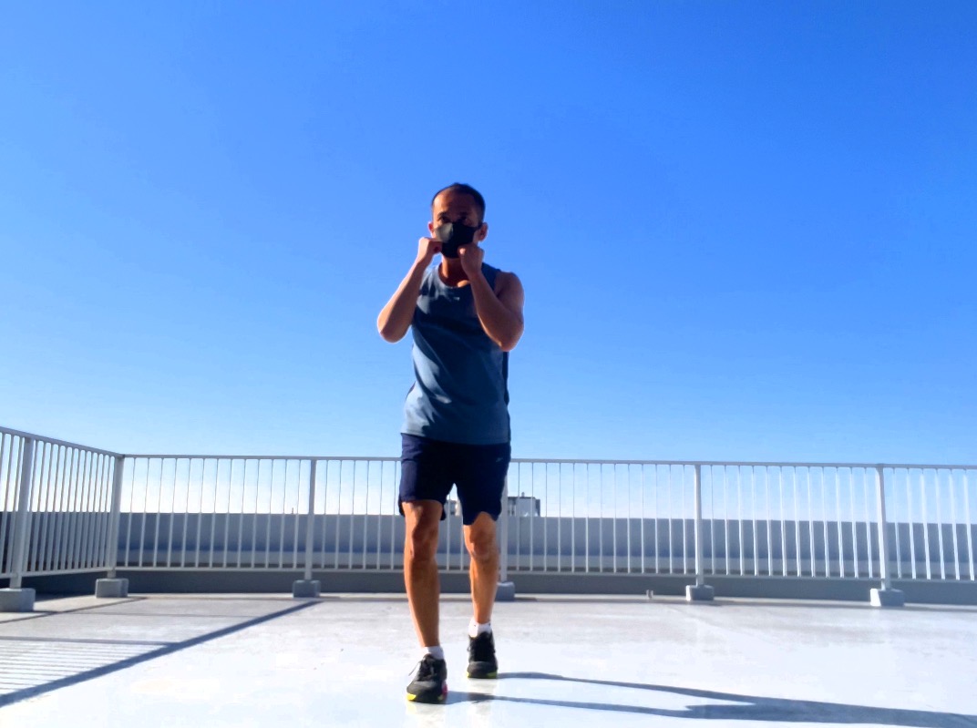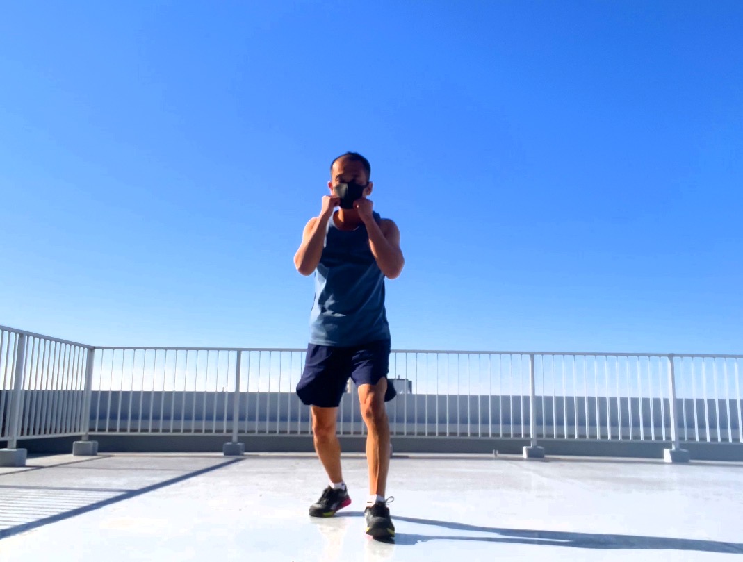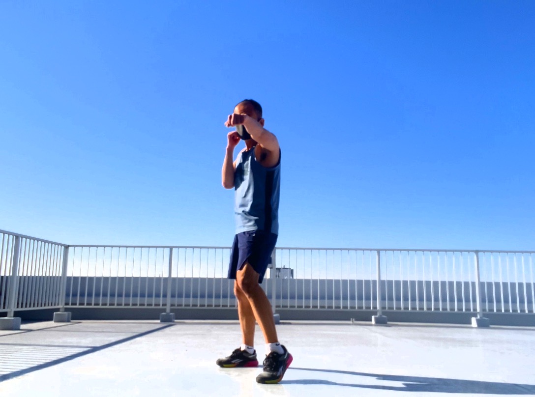 ボクシングガードをキープさせることで、肩の筋肉「三角筋」も使わさせることになり、その筋肉を温めることにもなってます。