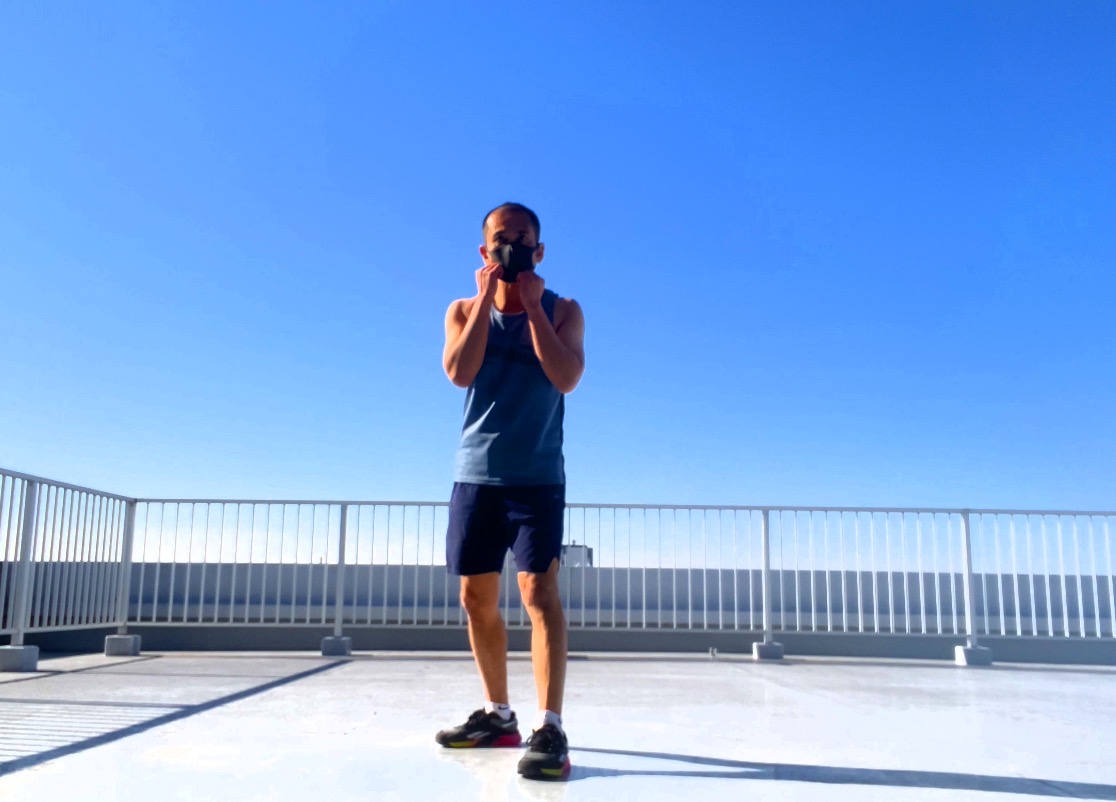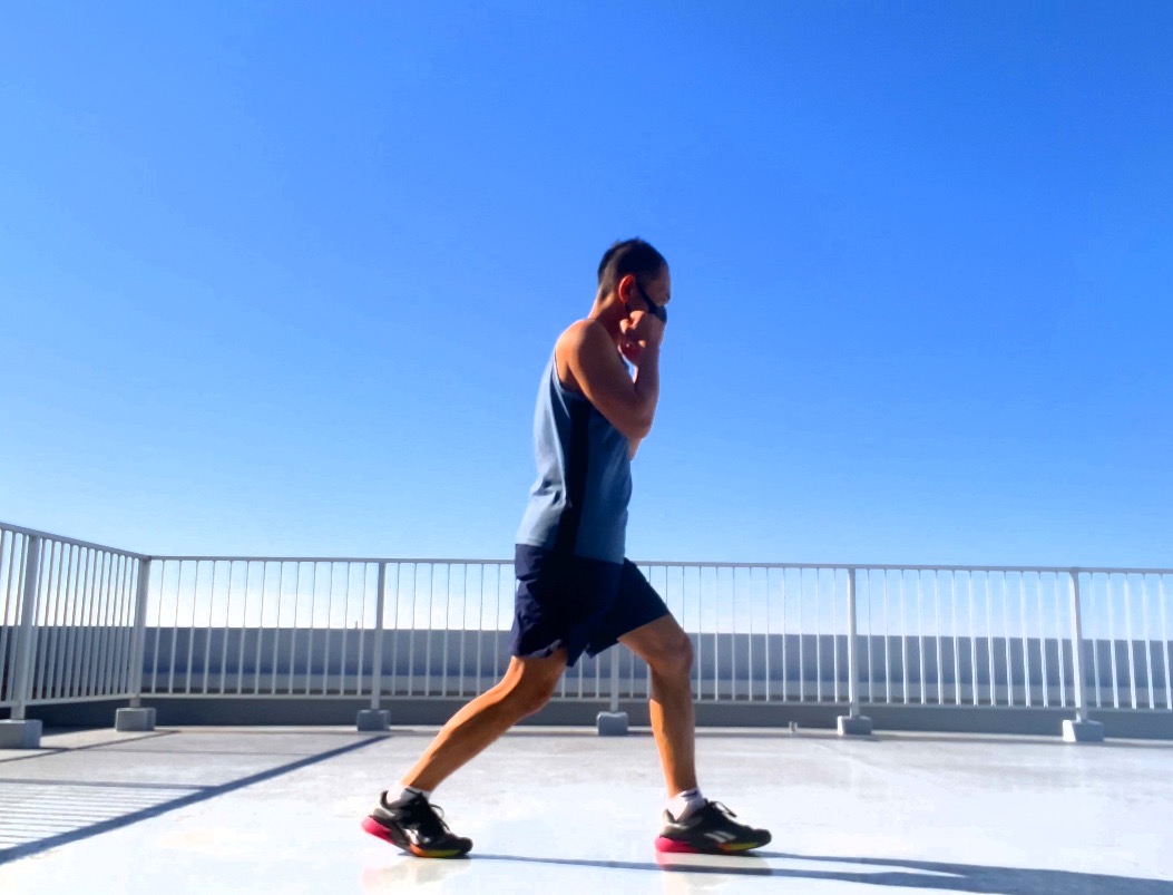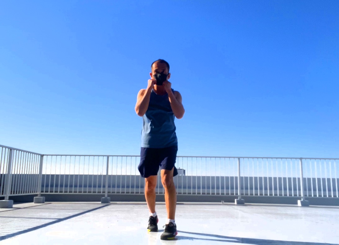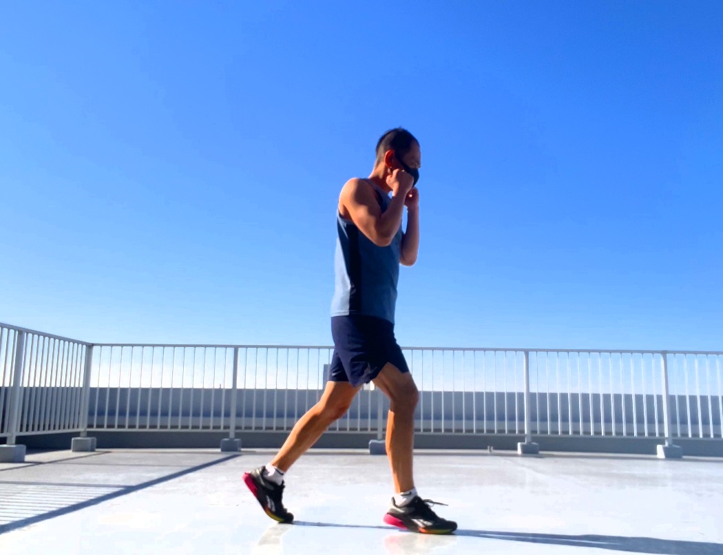 ボクシングガードをキープさせることで、肩の筋肉「三角筋」も使わさせることになり、その筋肉を温めることにもなってます。