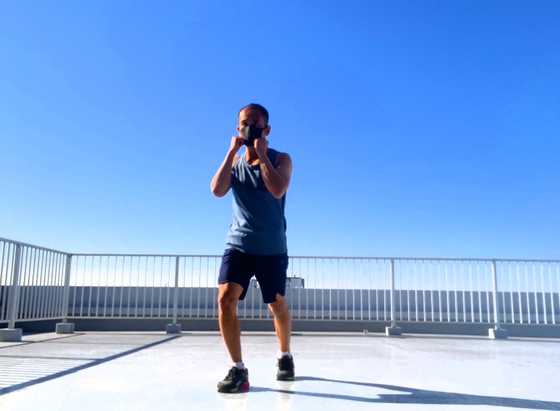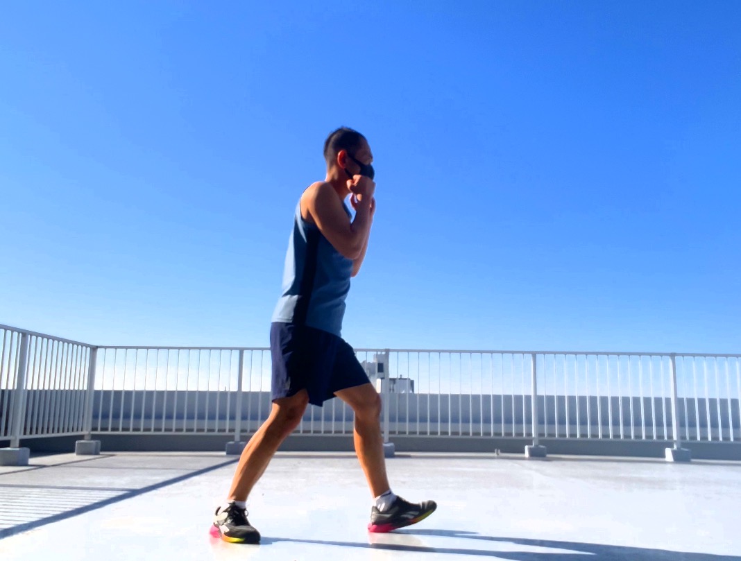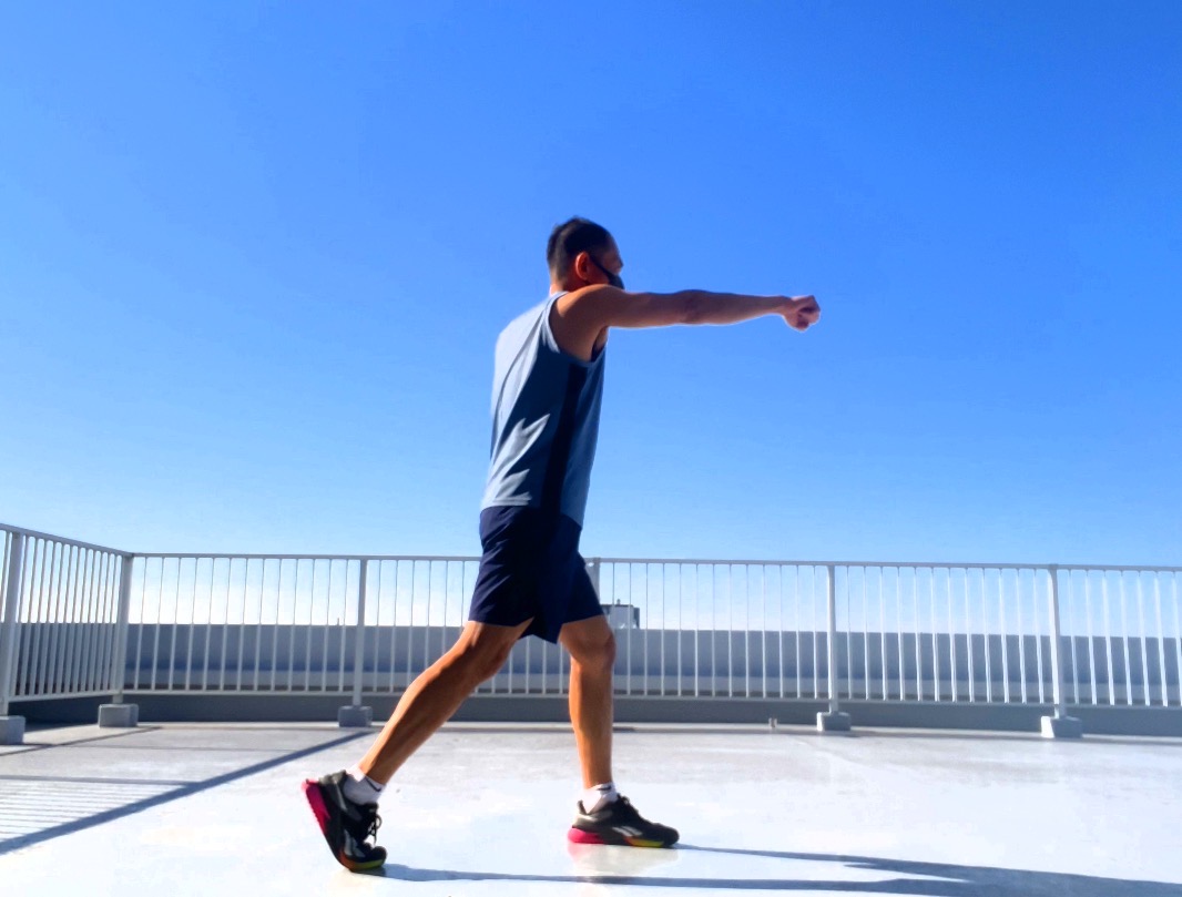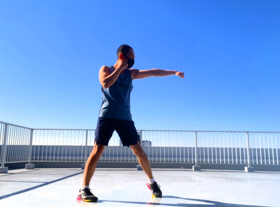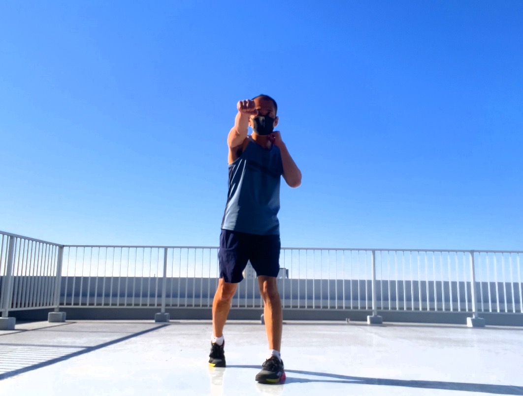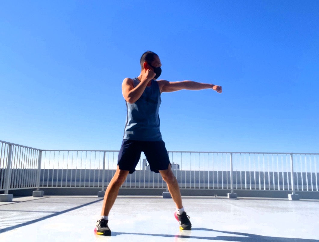 ジャブ・クロス・ジャブのように両膝を軽く緩め、体幹との連動も図りつつ、ここでは「おへそ中心で打ち込む」を意識しながら行うと、より運動効果が高まり、体温アップに繋がります。