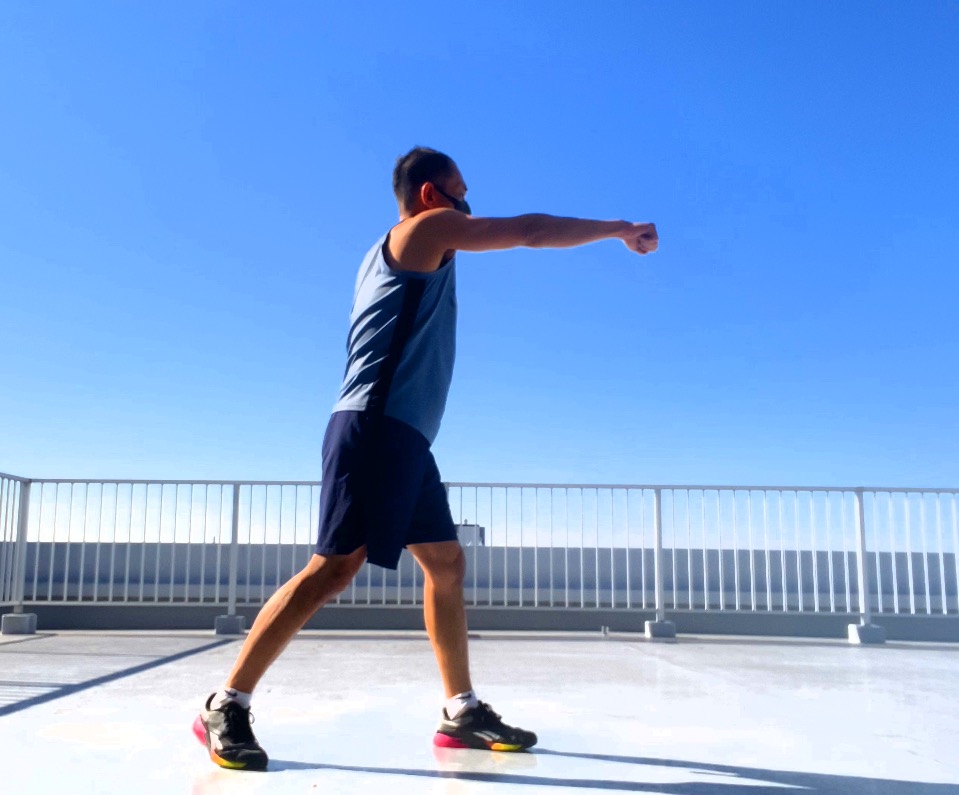 ジャブ・クロス、フックは膝を軽く緩めるようにし、体幹を使いやすくさせながら捻転動作を加えて打ち込むようにします。