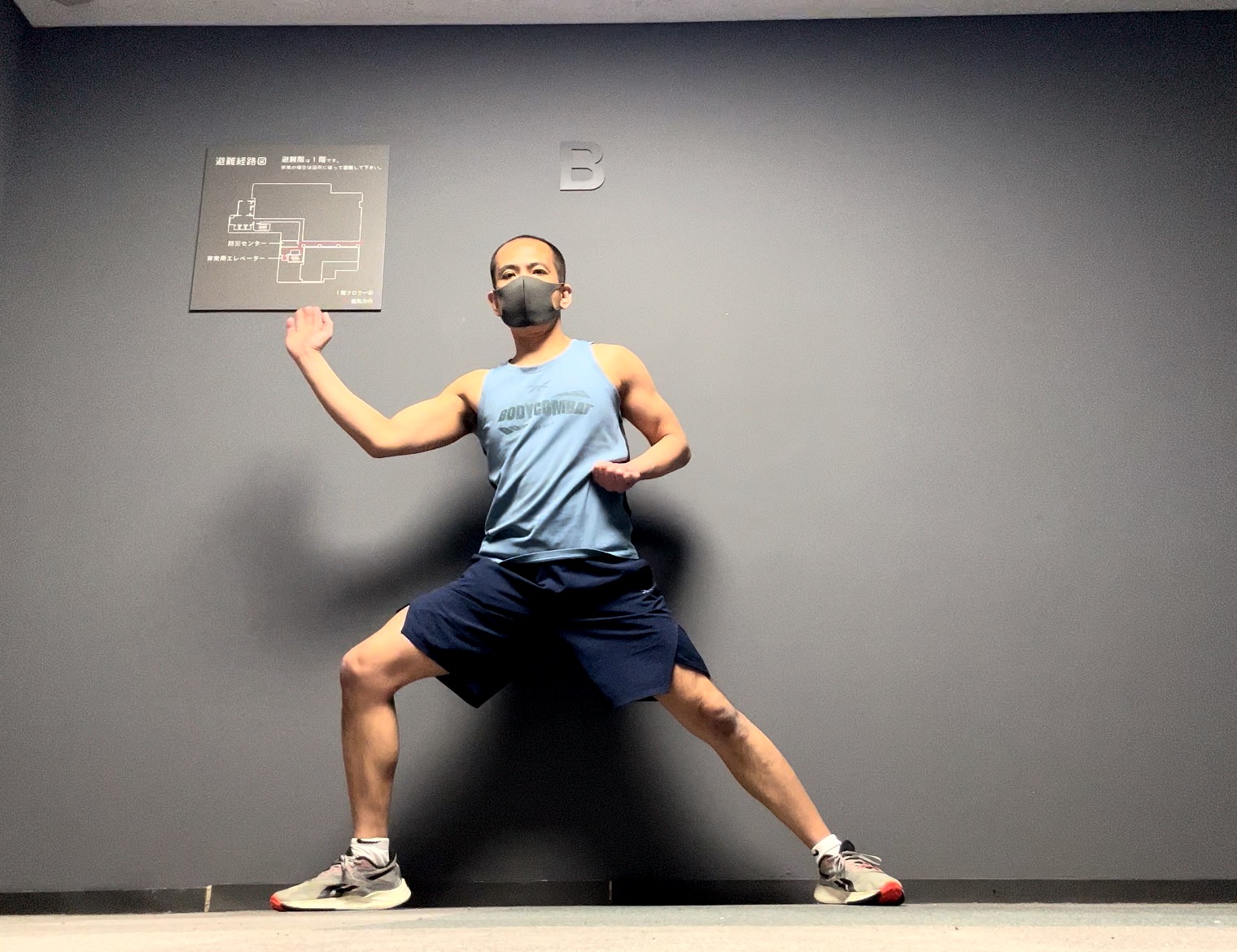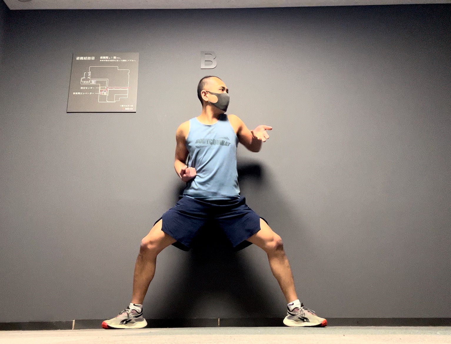 Aでは、重心はまだ真ん中のままで腰を落としながらサイドエルボーをゆっくり放ちます。