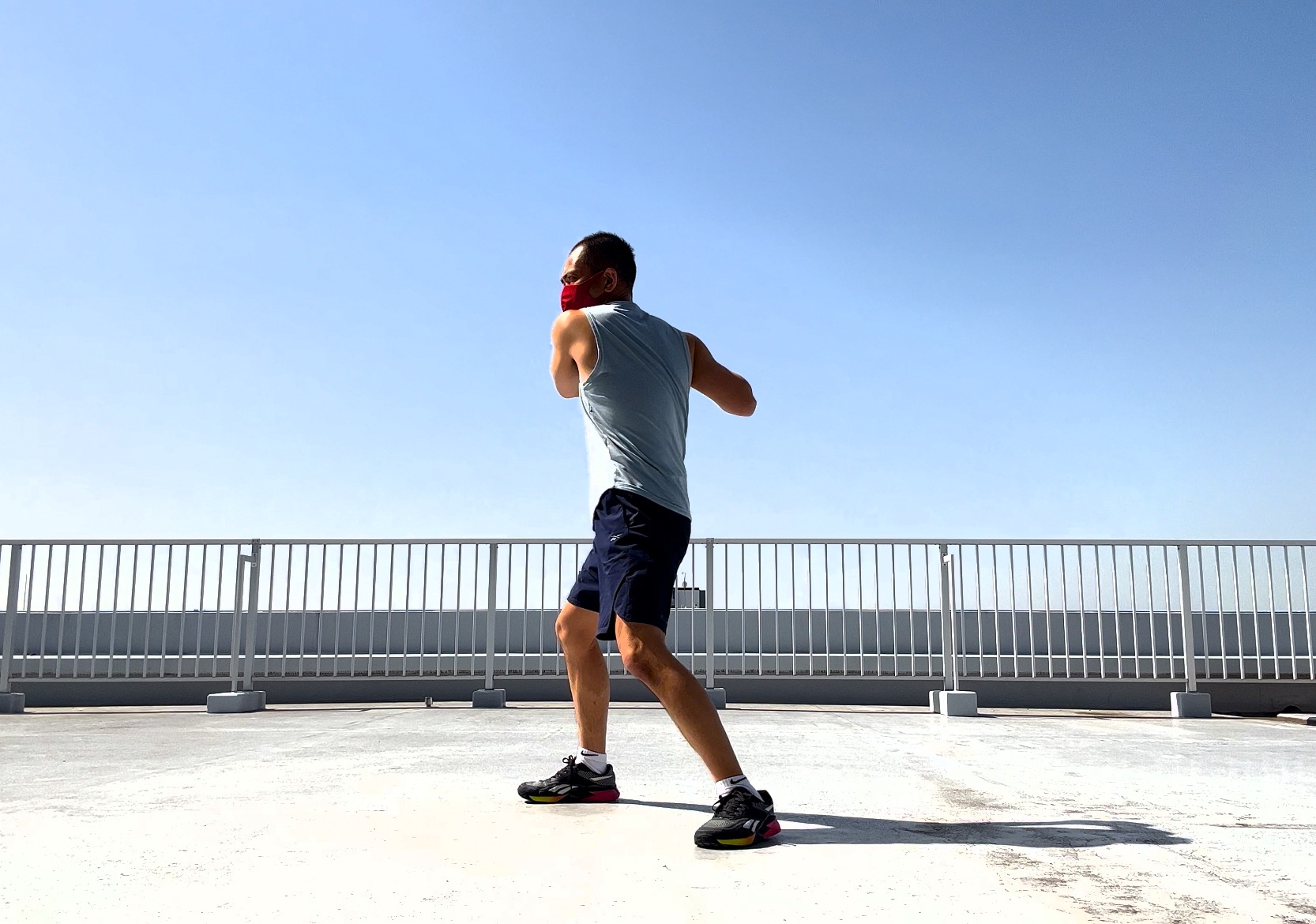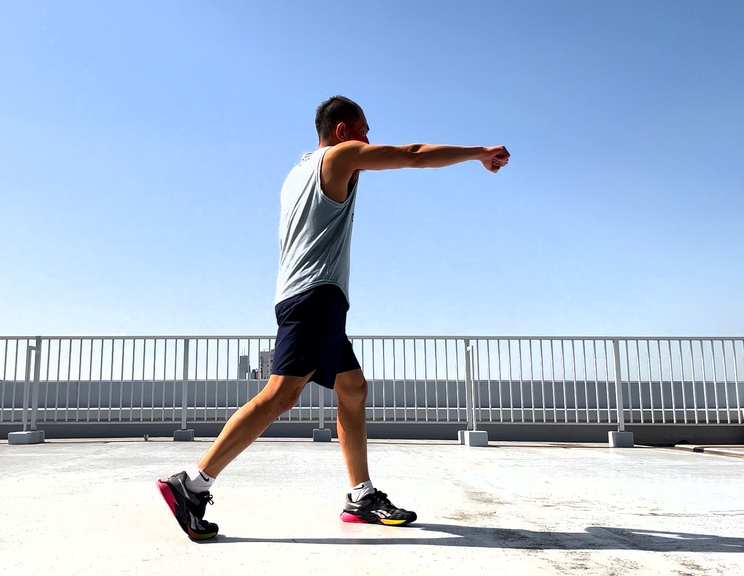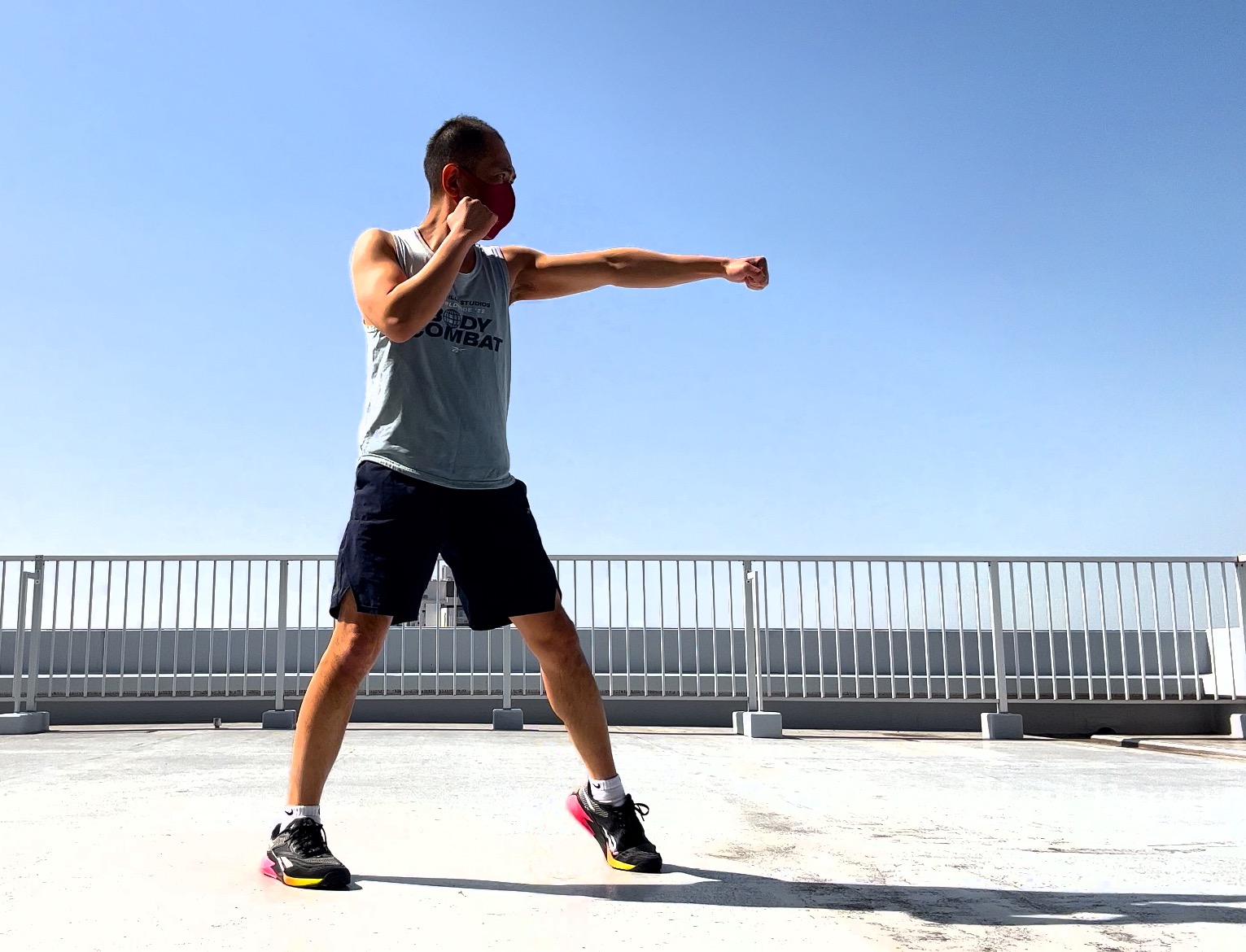 出だしのパンチ3発は手打ちにならないように、やや膝を緩めて体幹を使いながら打ち込みましょう。