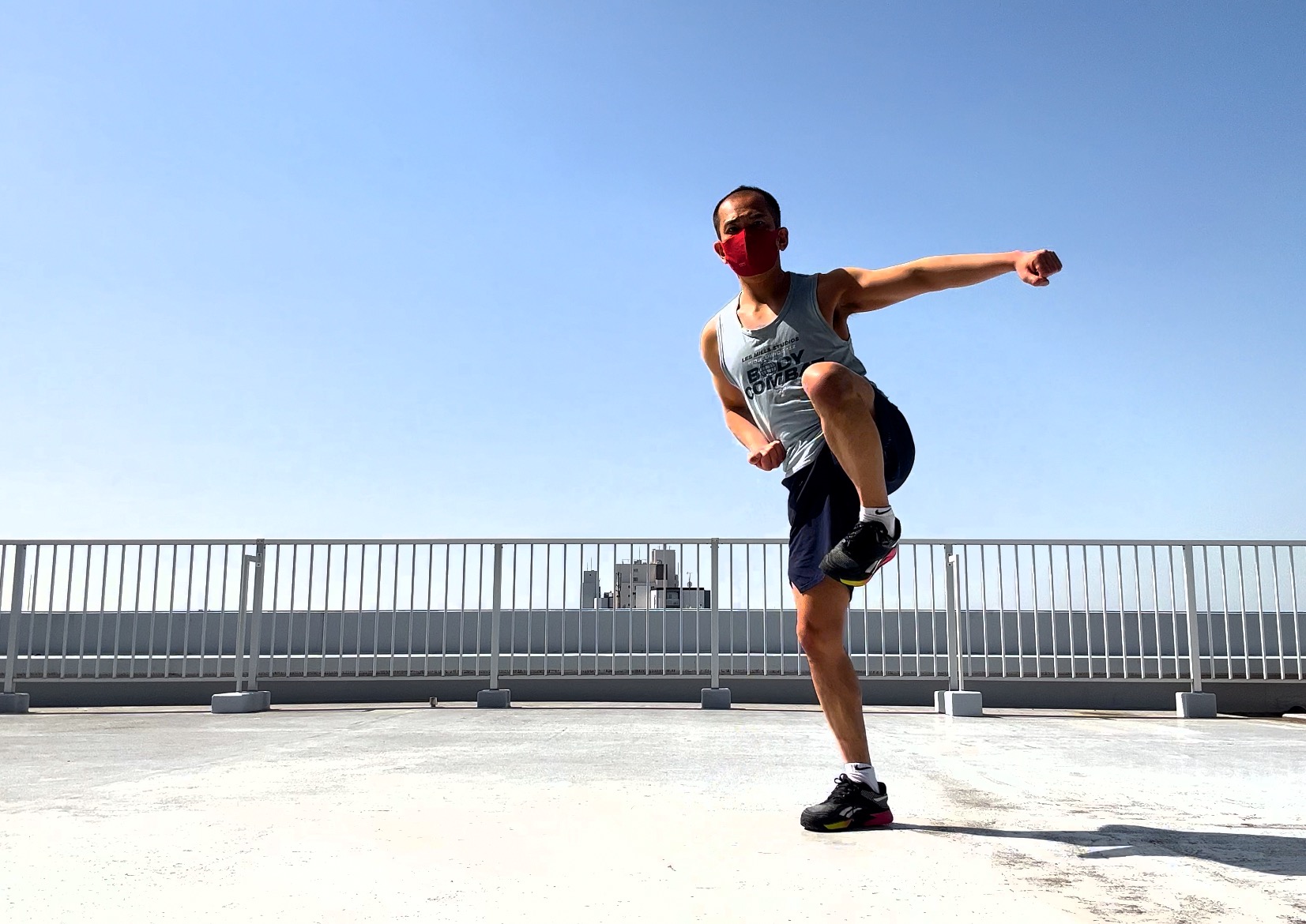 セット冒頭にやってくる、ラウンドハウスキックを交えたコンビネーション。