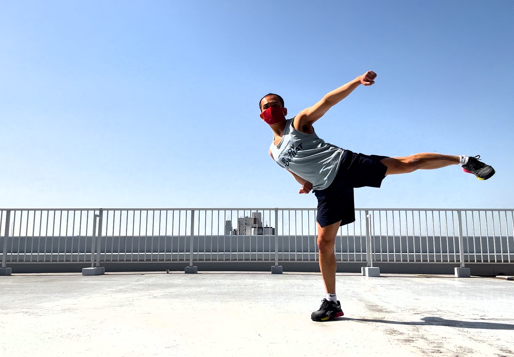 軸足となる後ろ足をスッと正面に踏み出すだけで軸足セットになります。