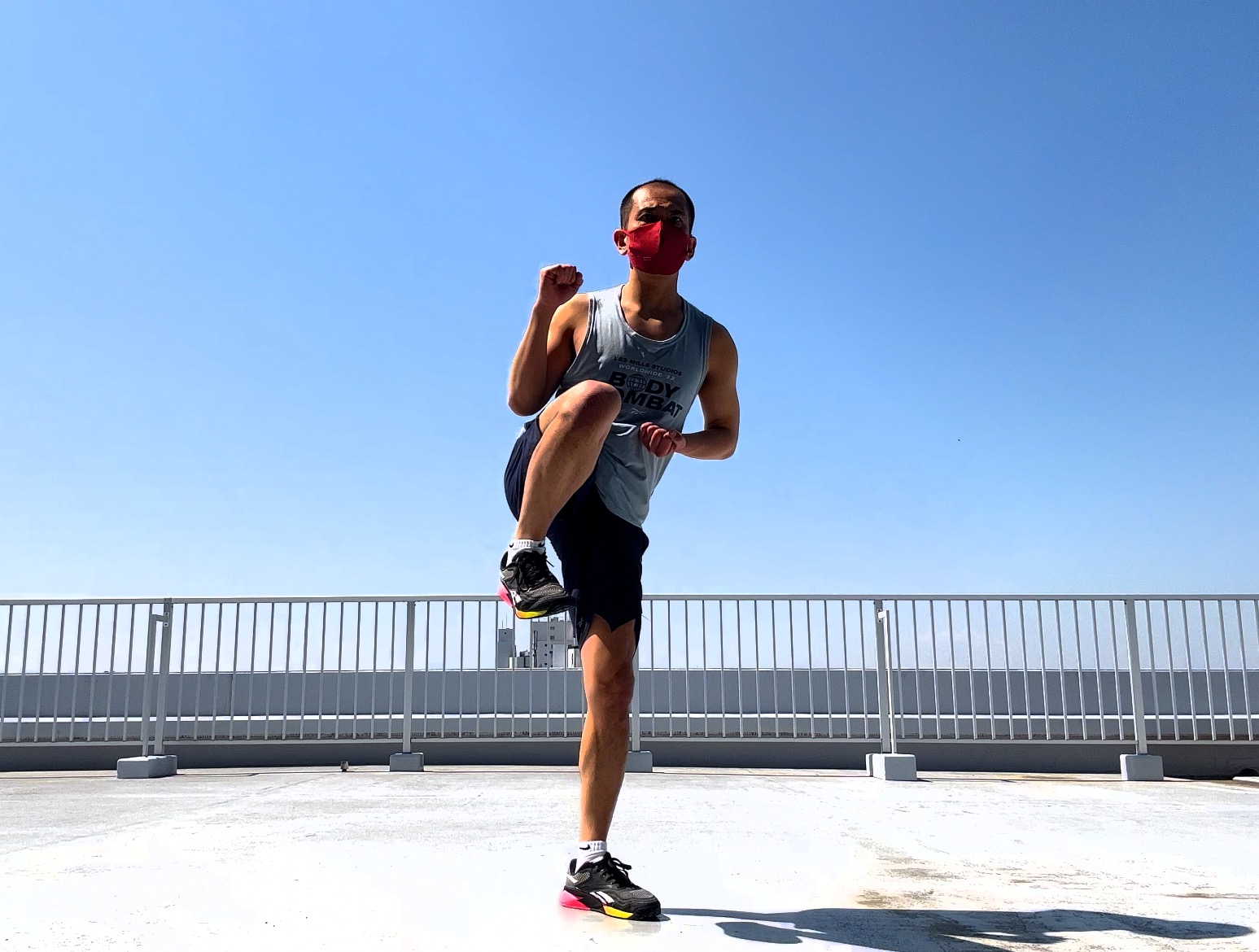 サイドキックは通常片腕を蹴る方向に向けて構えますが、このトラックでは↓のようにそれぞれ構えて、その構えが出来るだけ崩れないようにしながら蹴り込みます。