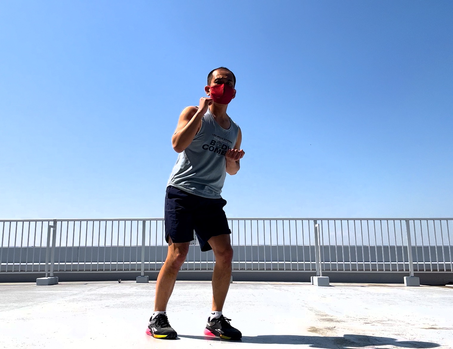 このコンボは「インパクトスクワットはサンドバッグを持つ仕草の時のボディコントロール」「どの局面でも両膝を伸ばし切らないようにする」がポイントです↓