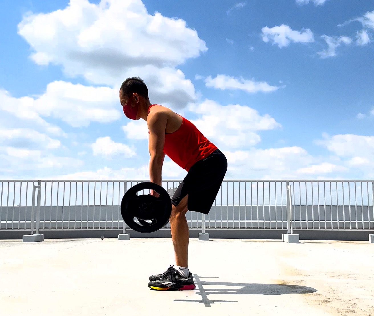 上半身を前傾させた時、バーベルと両膝が同じ高さぐらいなります。