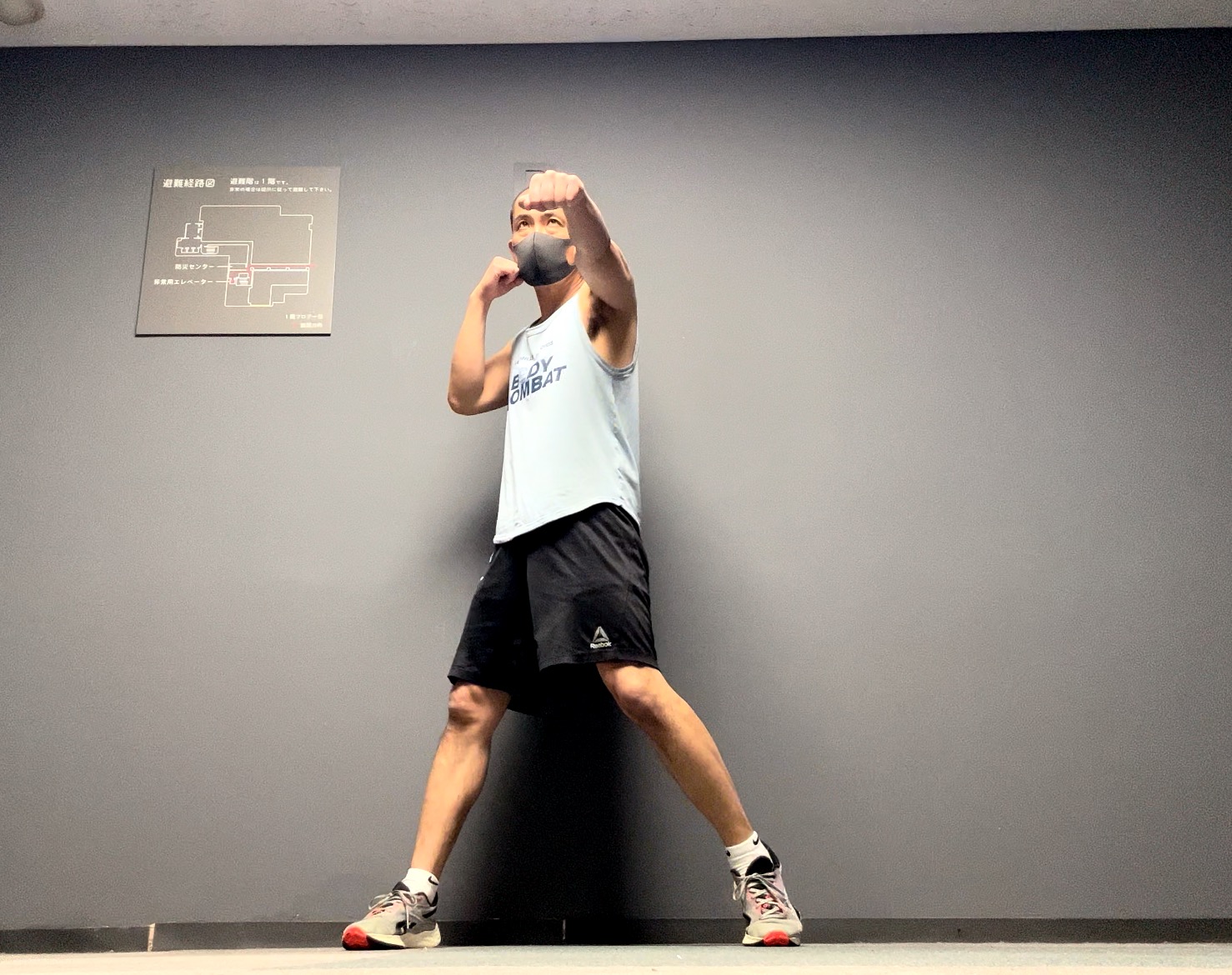 その場から一足分正面に踏み込むようにして運動量を上げる・格闘技らしさを演出しましょう!