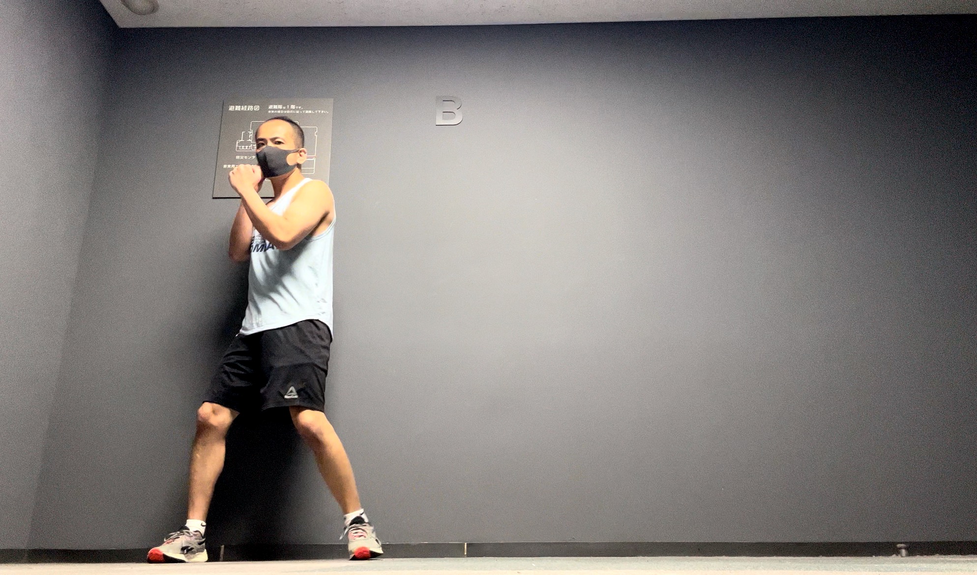 最新リリースでも登場するこの動作は、身体をやや沈めるようにしつつ、腹筋群の「腹直筋」をやや動かす意識で、少なからずでもコアトレに繋げましょう。