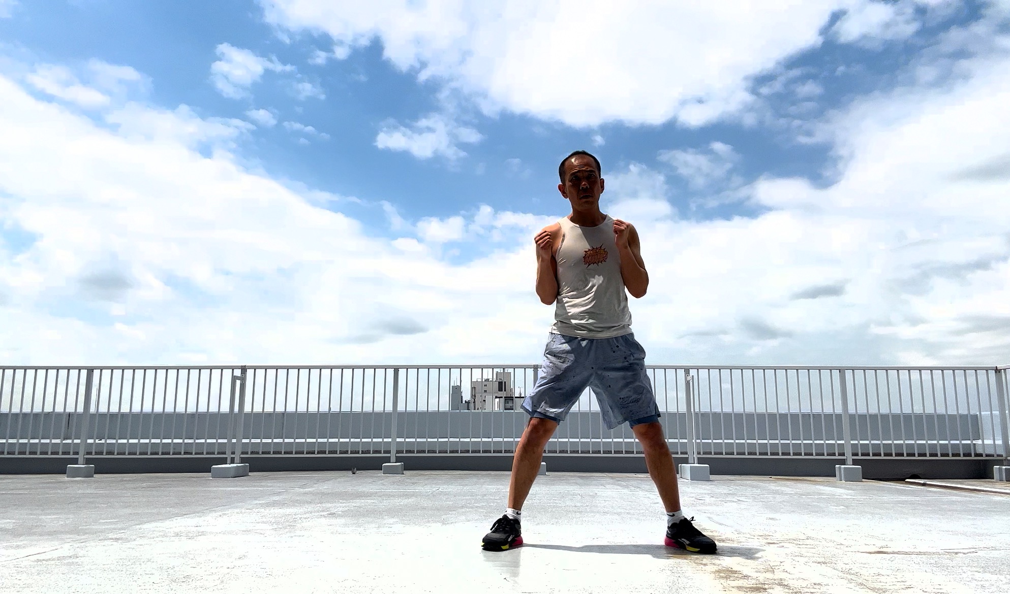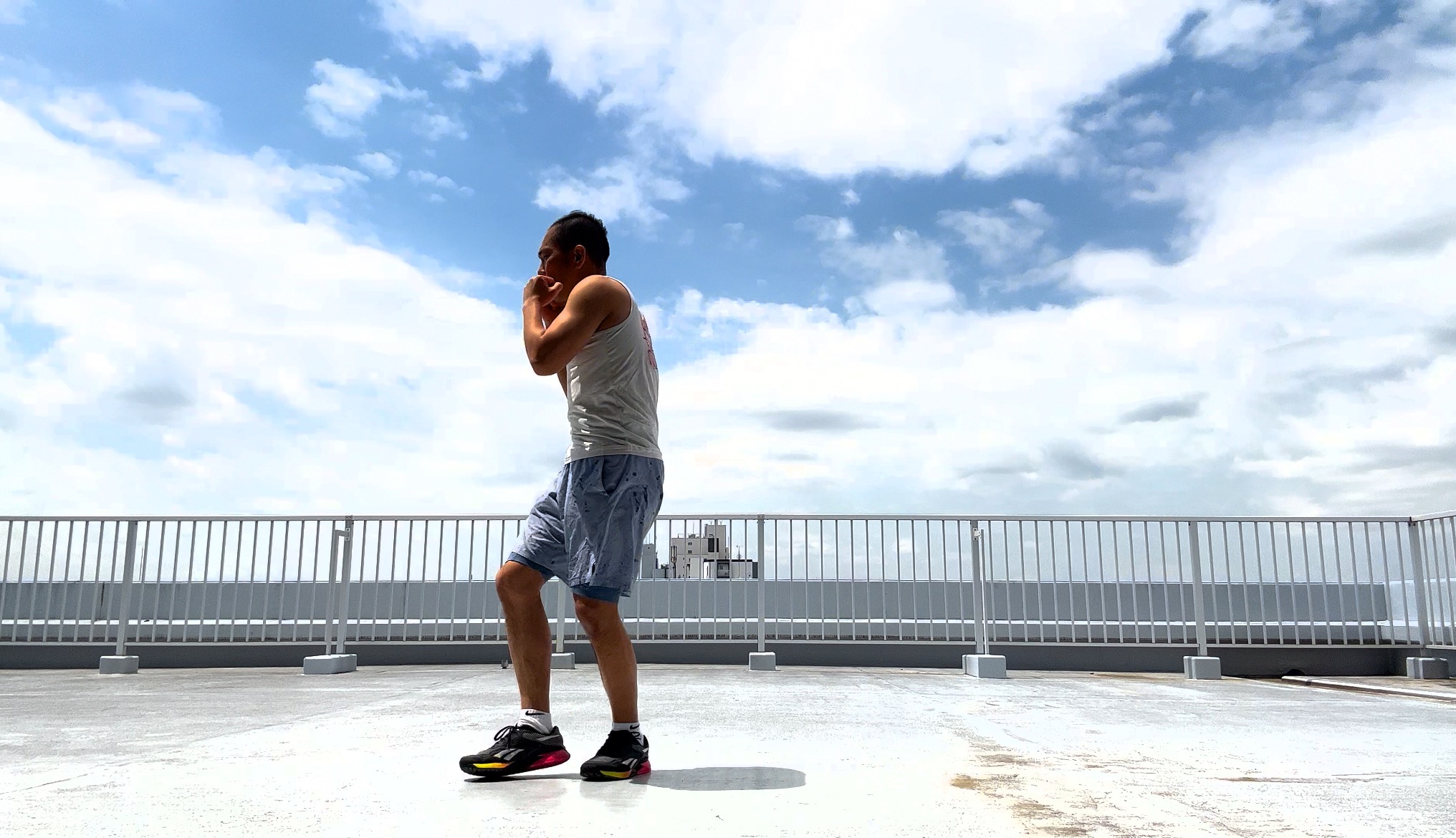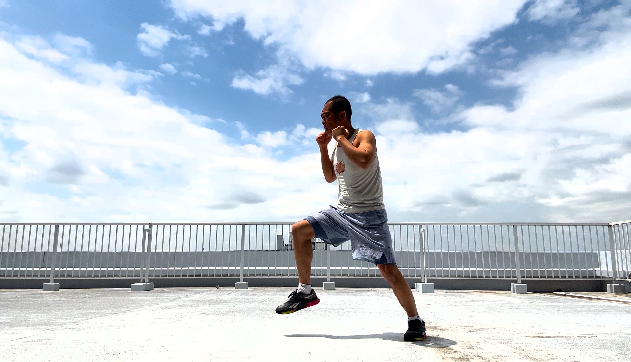 途中からのLEVEL2では、全ての動きをインパクトアップさせるので、横移動の「ジャブ・アッパー」は出来るだけ遠くに踏み込むようにして打ち込みたいので、膝を柔らかく使いながらホップさせ運動強度もアップさせましょう!