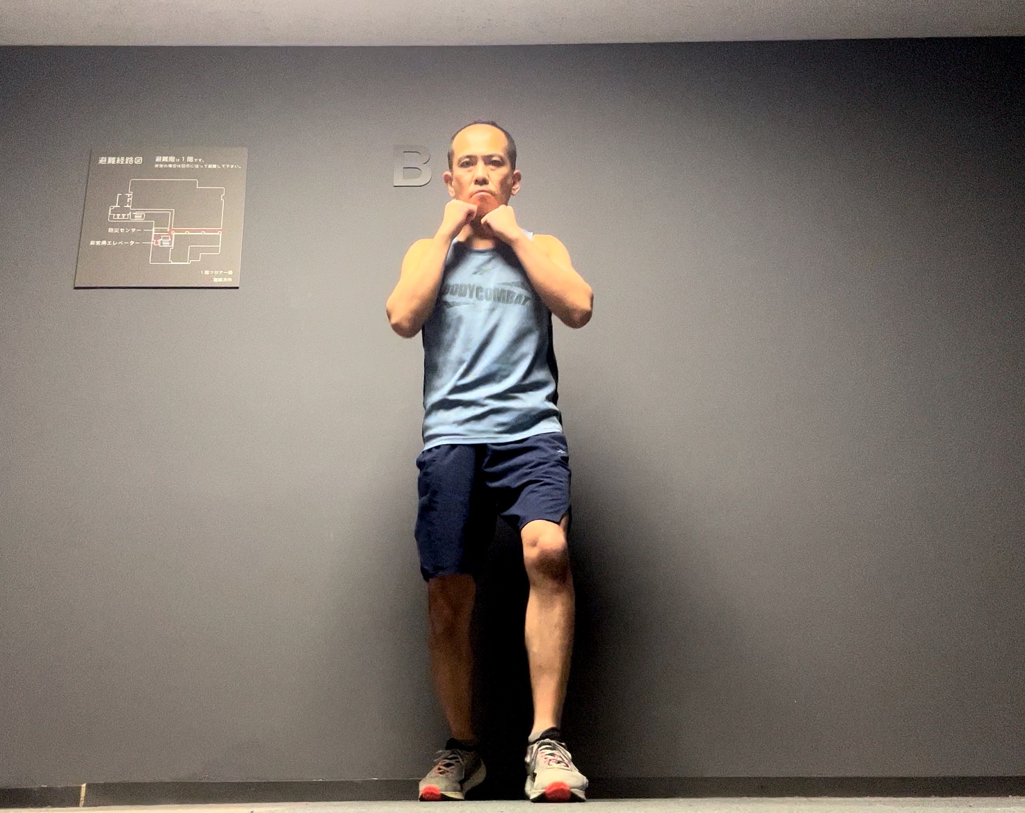 「肘は真上に高く持ち上げる・脇見せる」「重心はやや前に押し出す」の2点で運動量を上げましょう!