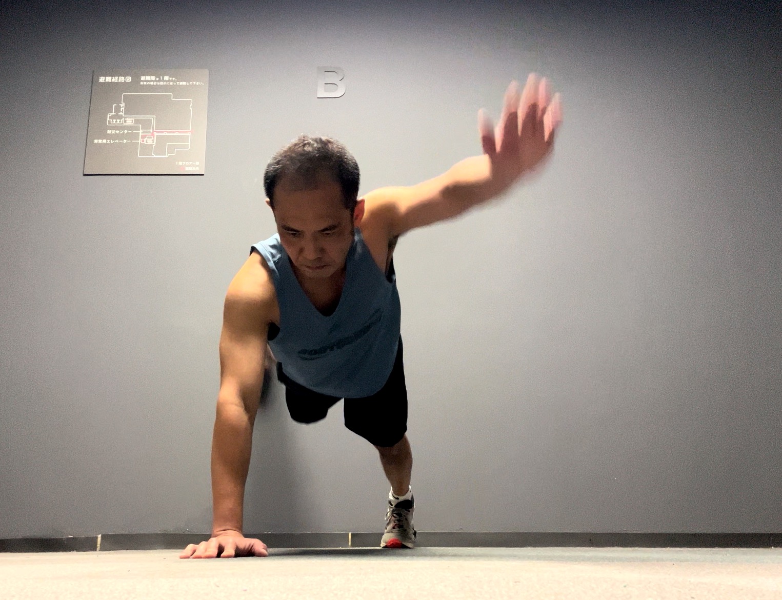 プランク状態から手の平を斜め45度方向へ開くようにしながらフロアタッチを左右繰り返します。
