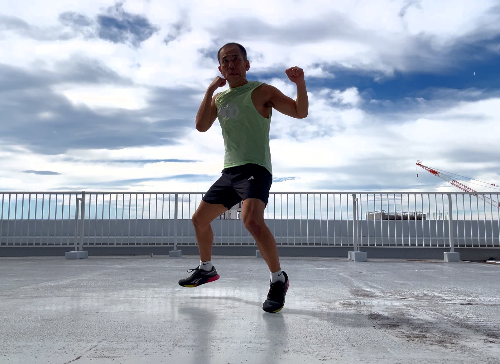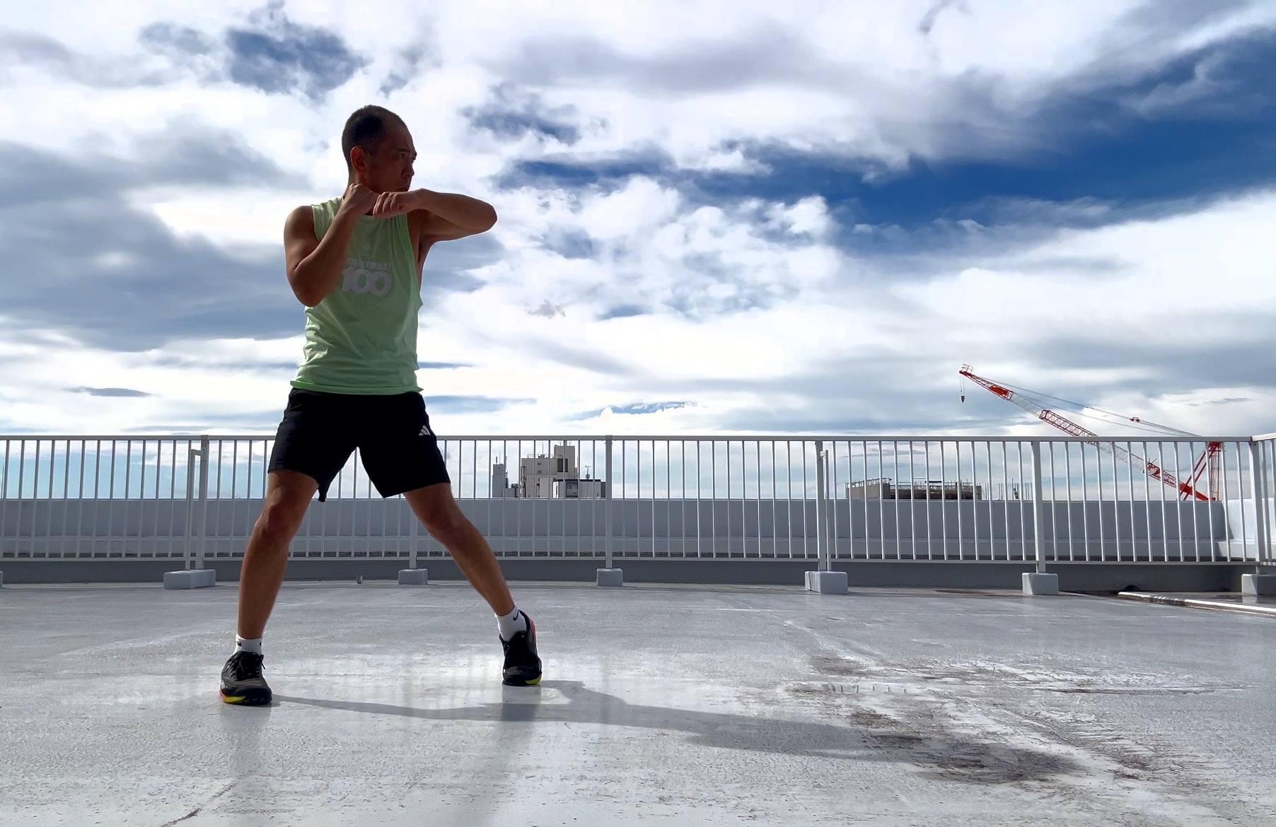 コリオ:「正面へジャブ+真横へピボットジャブ 3往復+ドロップスクワット」のフォーム