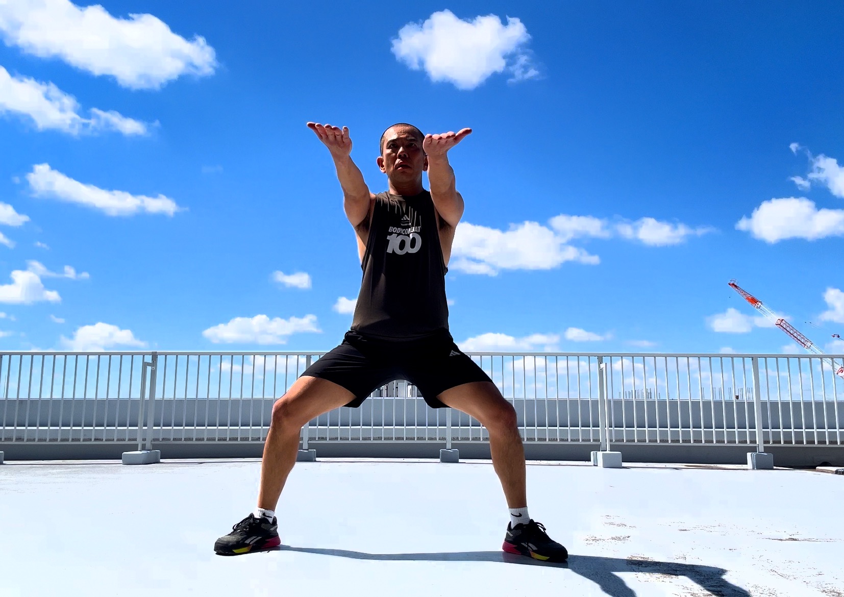 そのドロップスクワットではその着地時に両膝がつま先よりも前に出ないよう、カカト重心で臀部の筋肉に負荷を掛けるようにコントロールを!