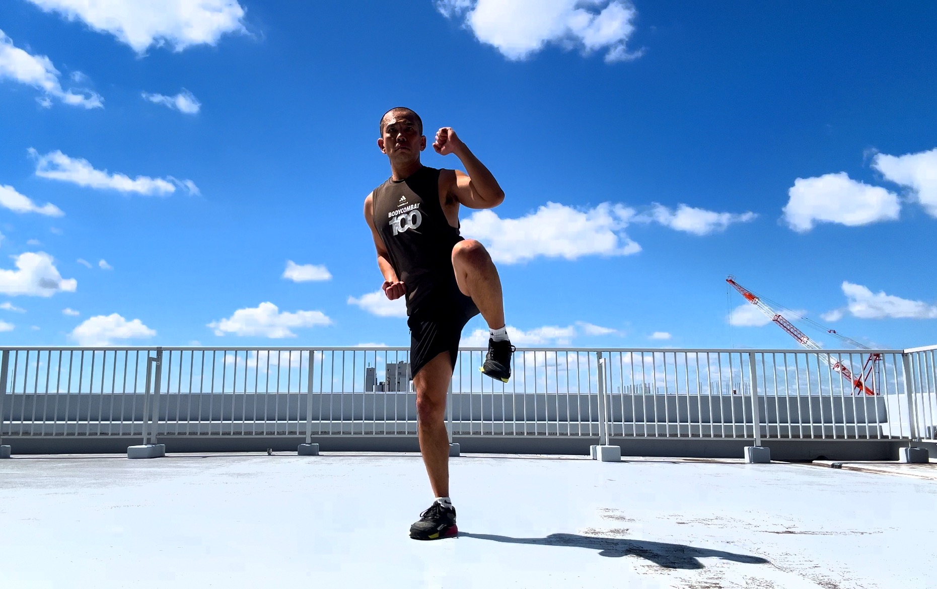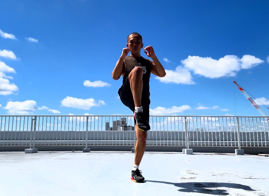 ステップインで踏み込み後、素早くニーアップ→垂直気味の軌道で蹴り込みましょう!