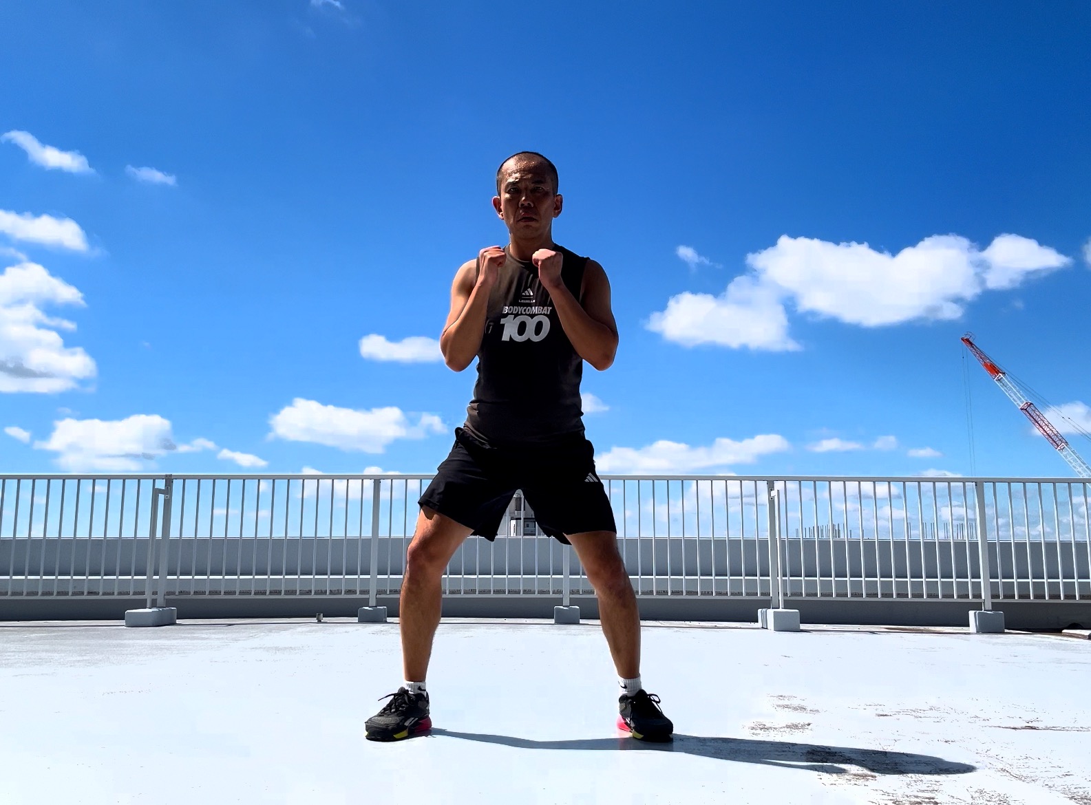 テクニックポイント:ホップ&ドロップスクワットで運動量アップを!