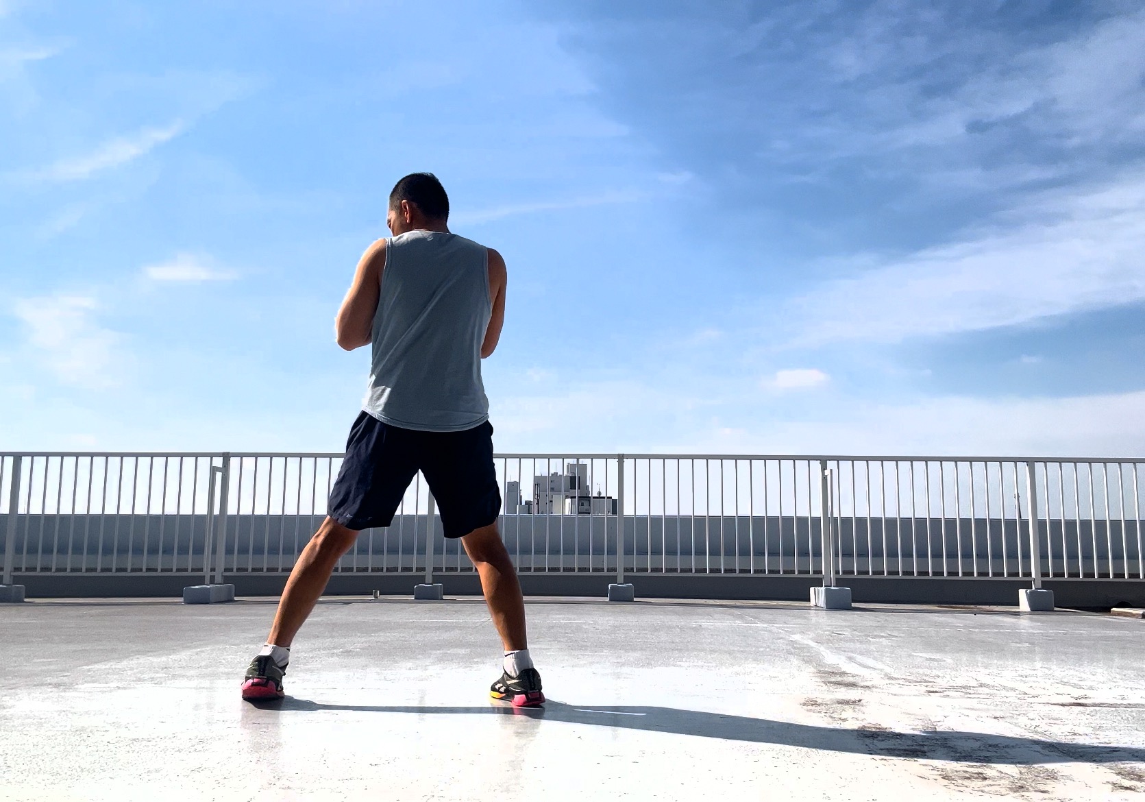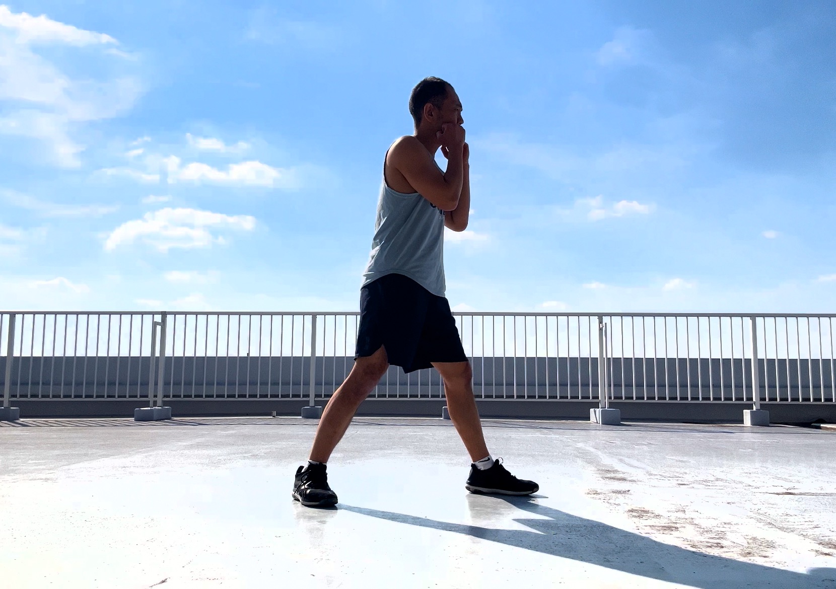 16レップ繰り返しますが、膝を緩めつつ、カカトを床から持ち上げながら腰を回し体幹と連動させて、コンパクトに打ち込むようにします。