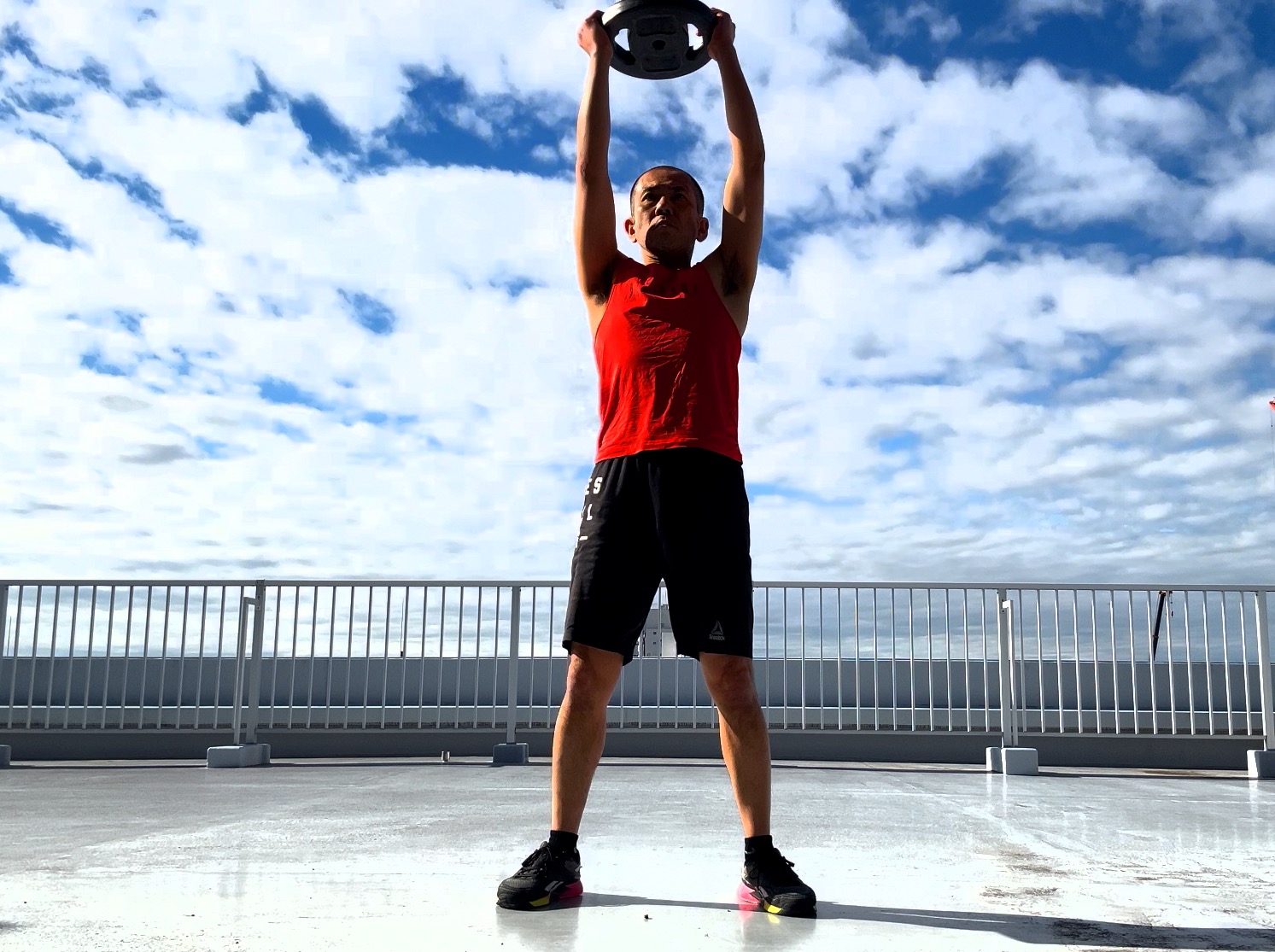 スクワットのミッドスタンスに狭めて、プレートでのクリーン&プレスを行います。