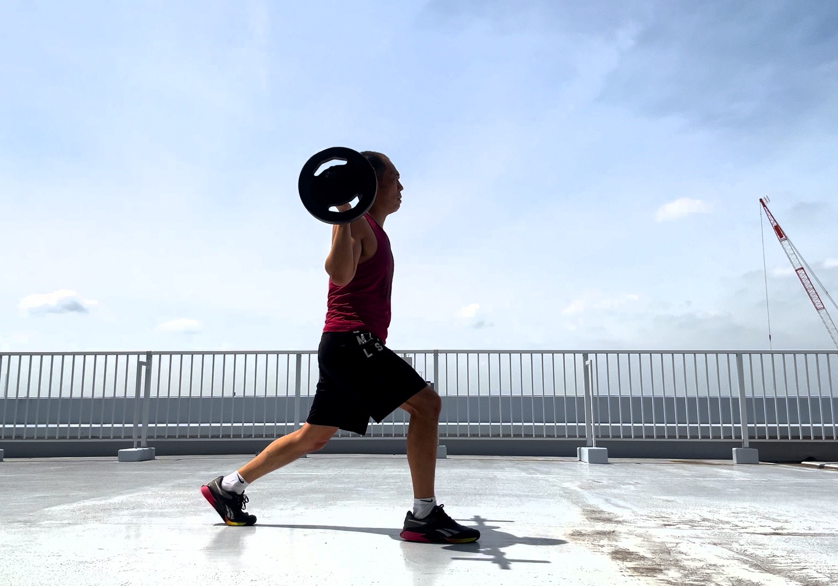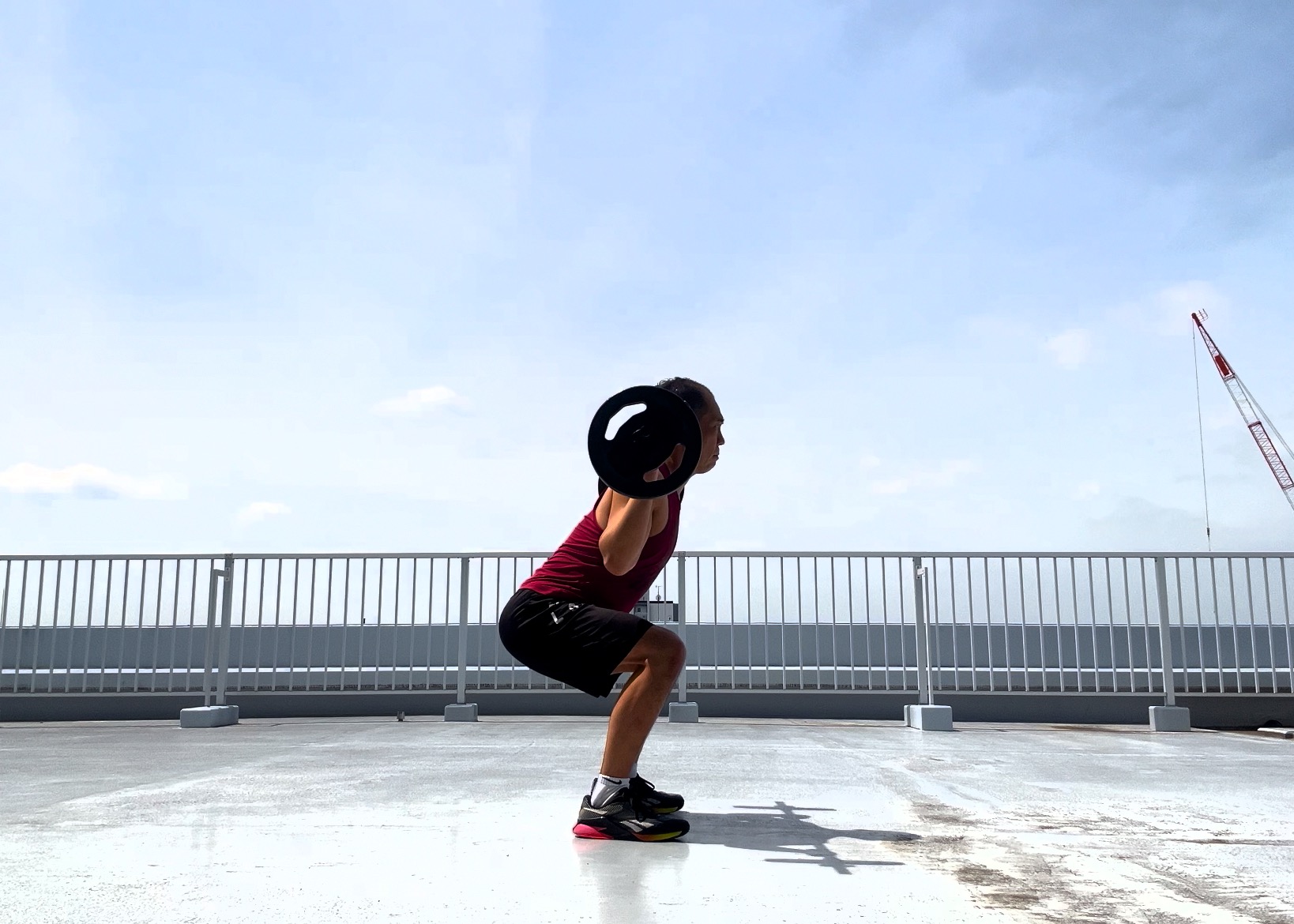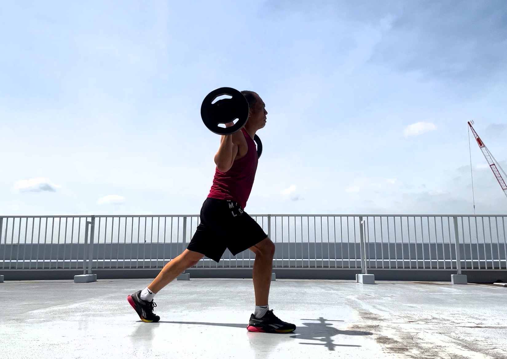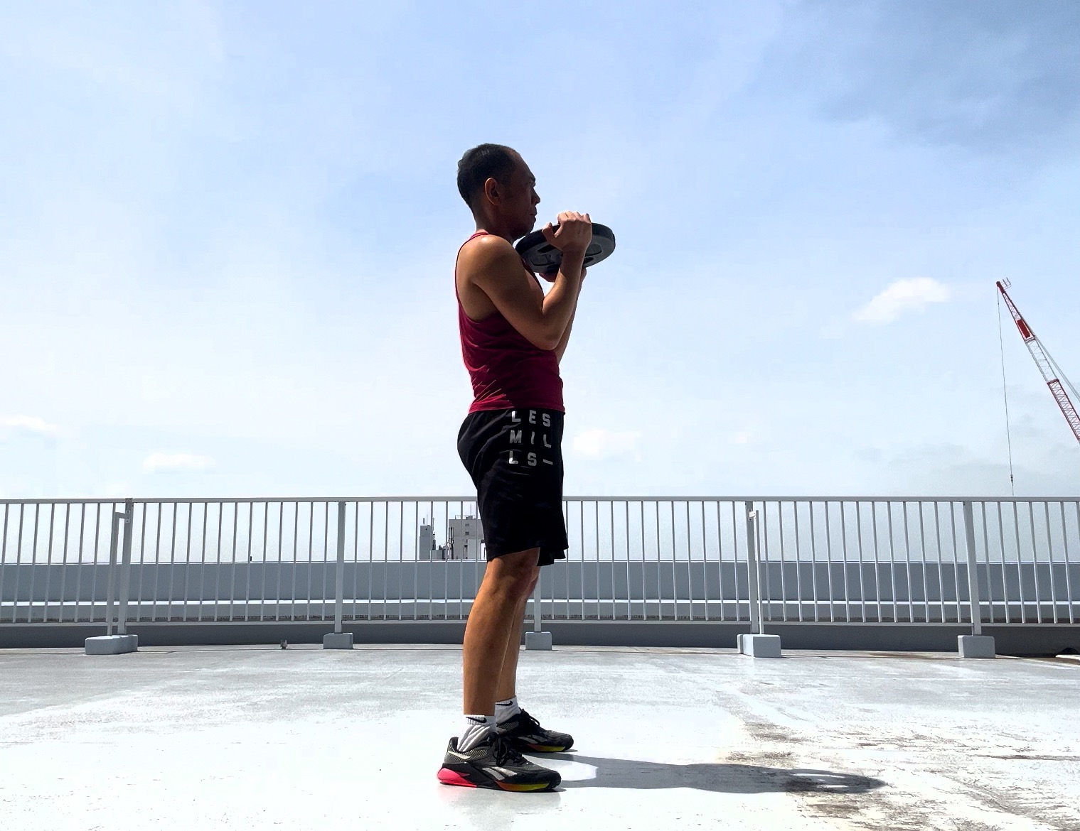 プレート使用でのコンビネーションでは、フロントスクワット時と同様で、ショルダープレス1回を行うようにプレートをプレスアップを!