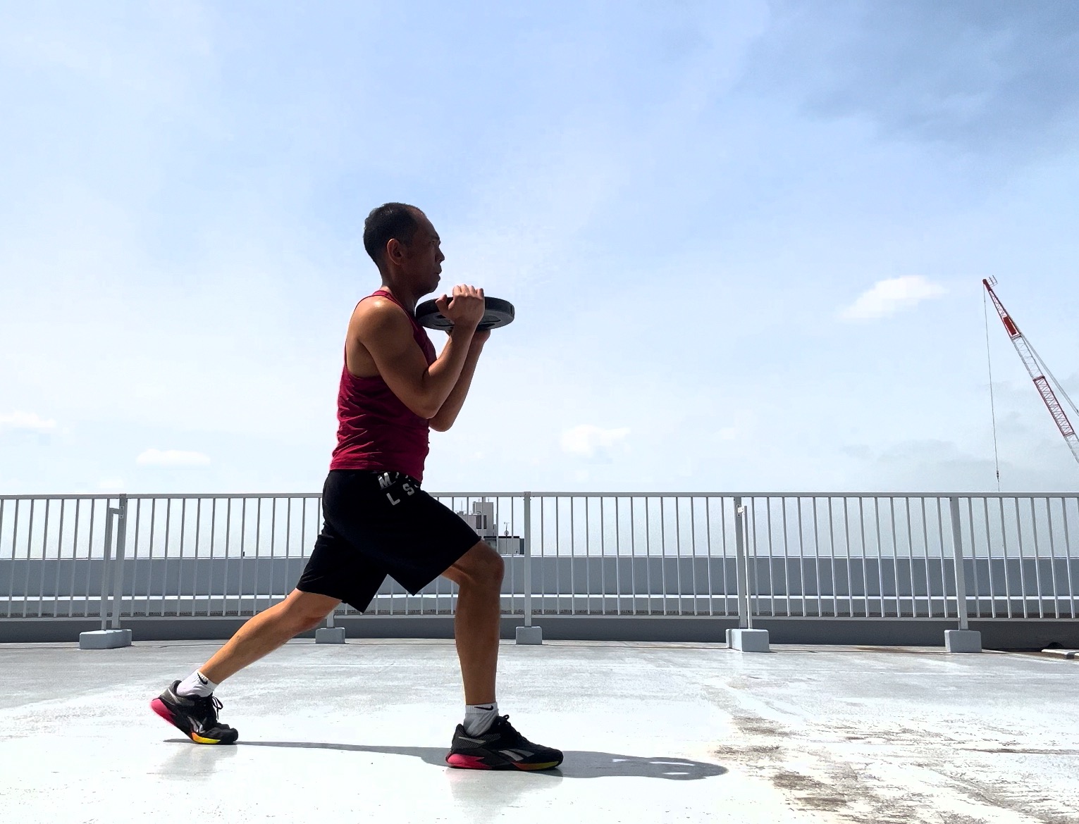 通常スクワットよりも強度が高いフロントスクワットとランジ。
