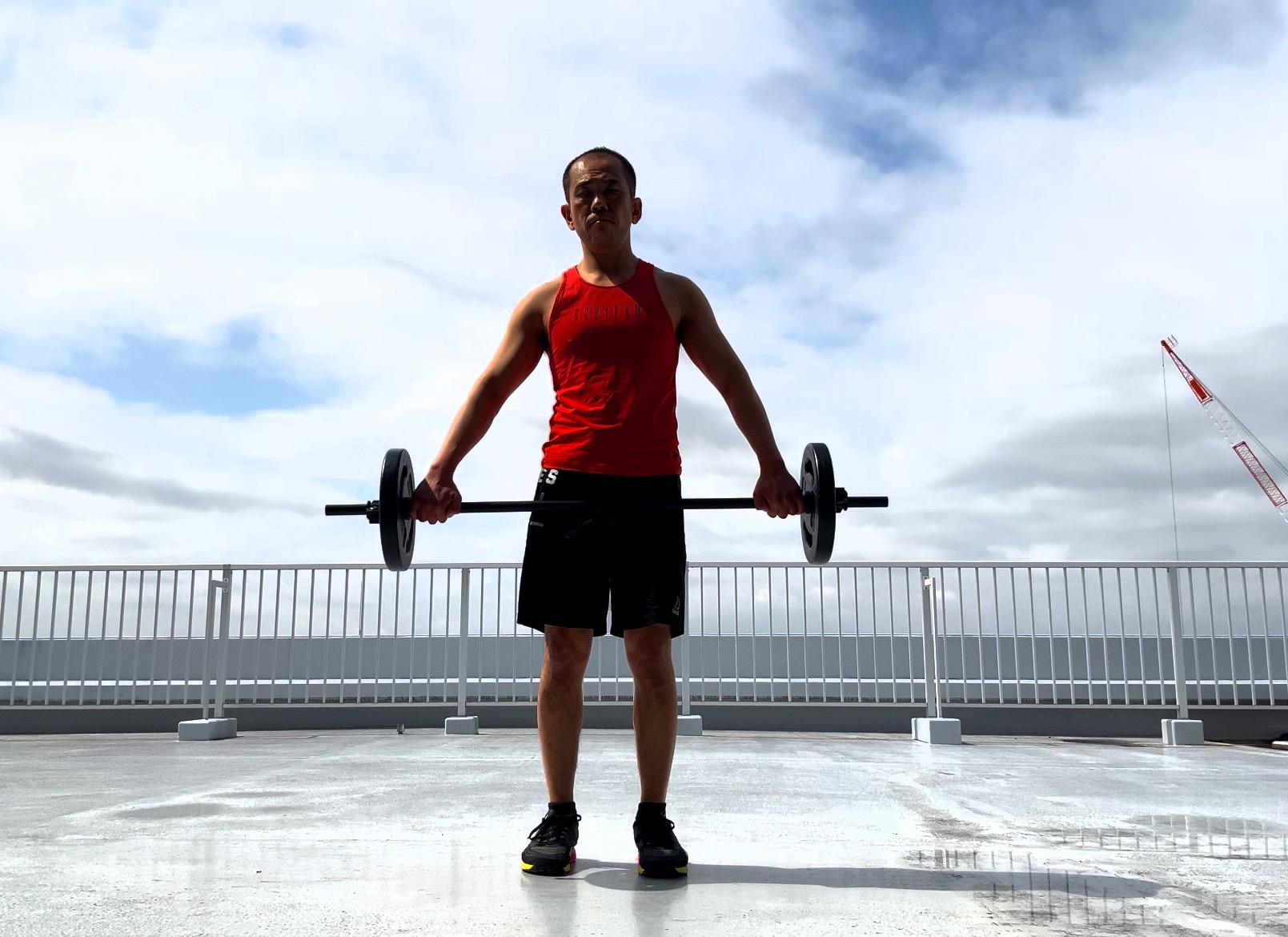 トラック締め括りは、持っているバーベルの持ち幅をワイドグリップに変えてのローイング動作、連続12回で終了。