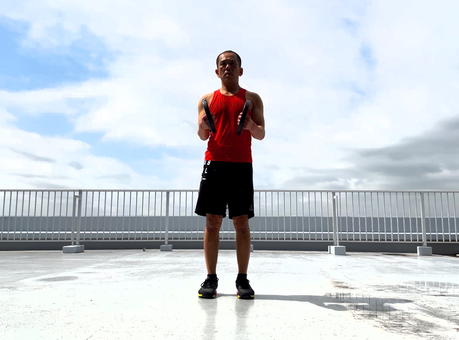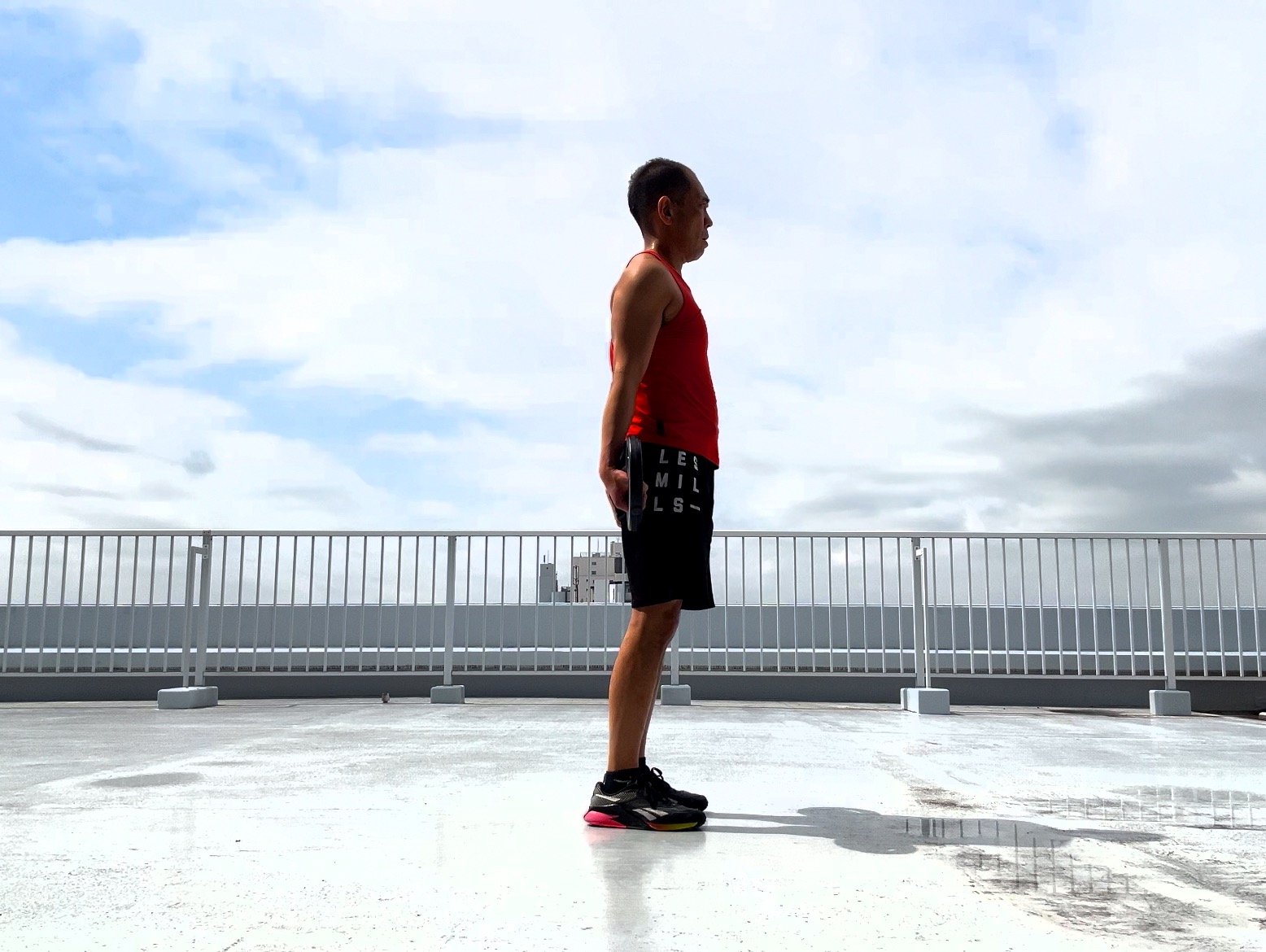 この時、疲労蓄積してくると、首回りがすくんでいくエラーフォームになりがちなので、首を逆に長いイメージで保ちながら繰り返すようにしてください。