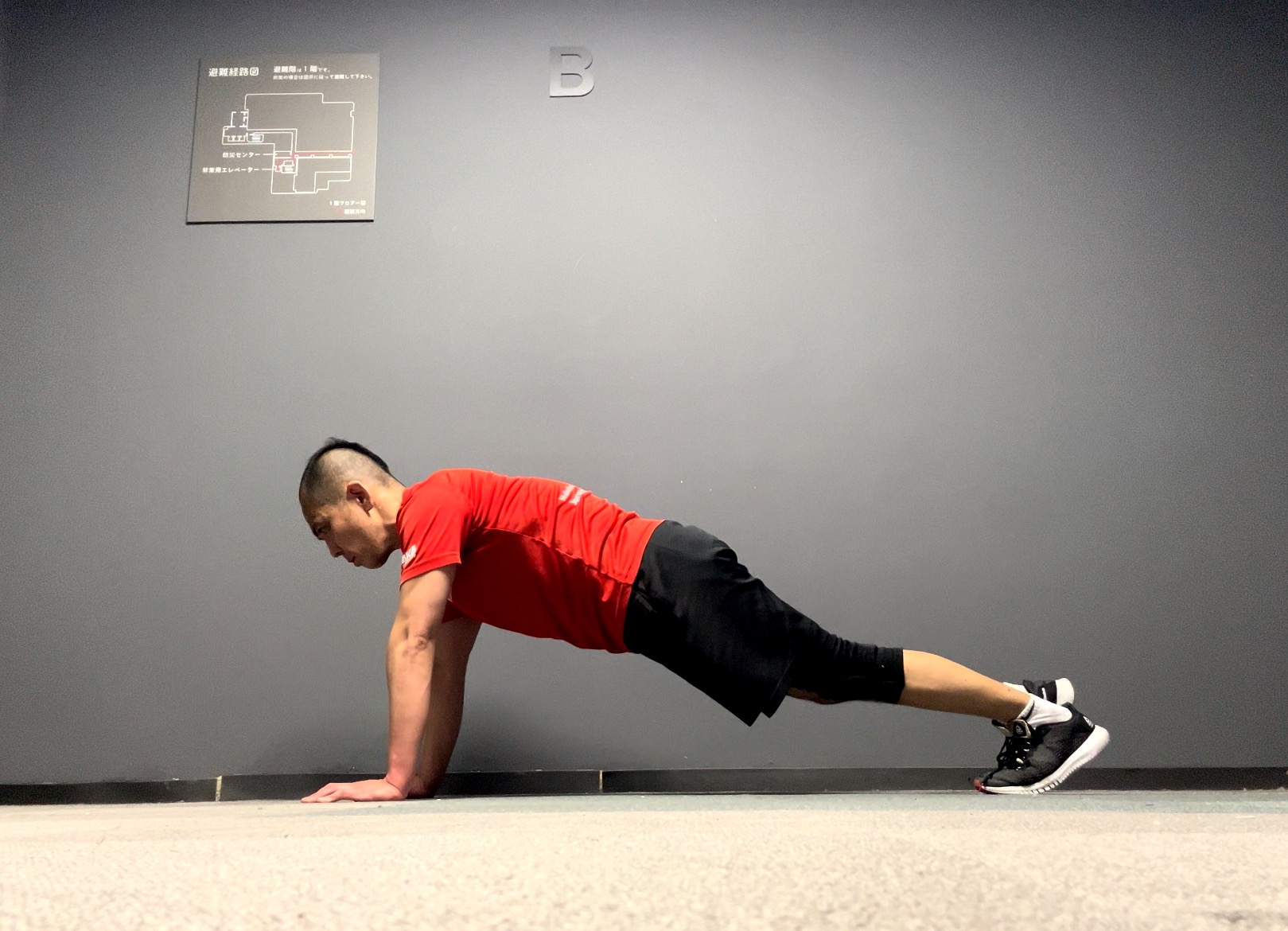 サイドホバーwithヒップリフトで横向きになっていた身体を、下を向いてプランク状態にスイッチしてマウンテンクライマーを行います。