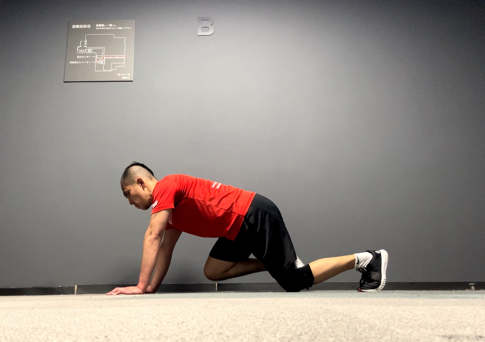 さて、このトラックのマウンテンクライマーでは、片脚だけを動かしてのマウンテンクライマーを行います。