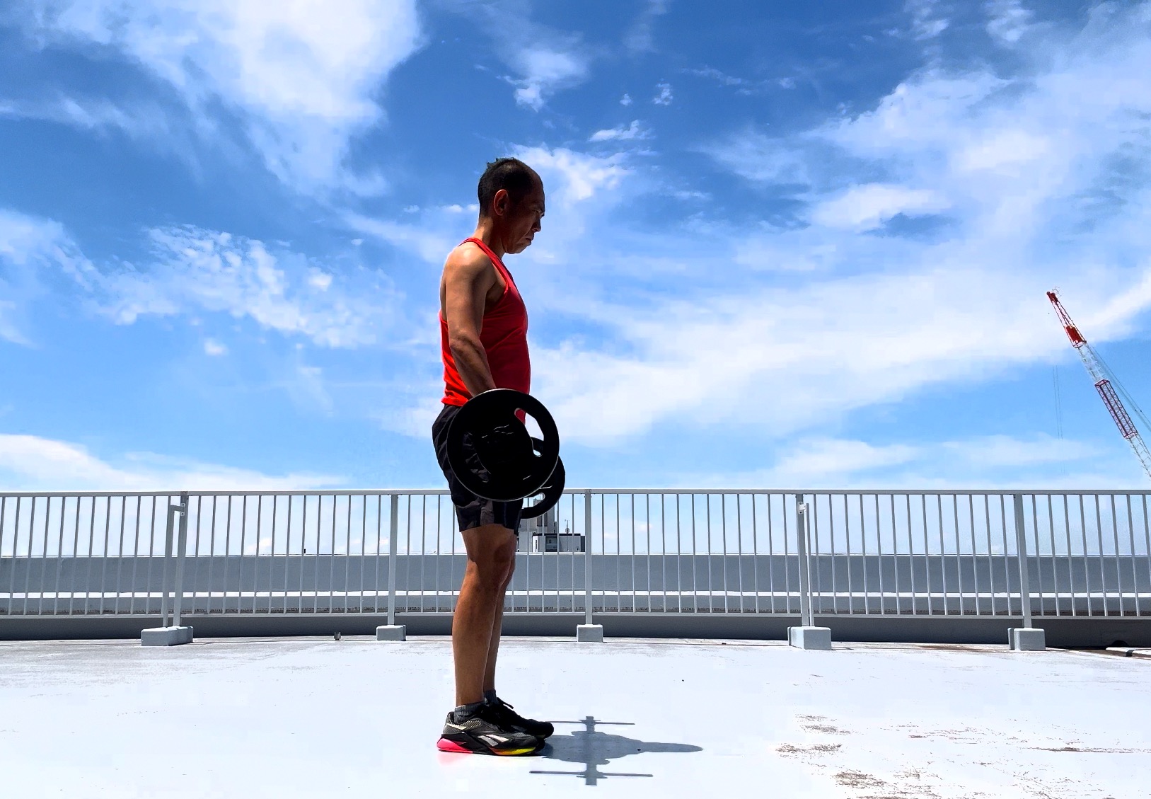 バーベルからプレートに持ち替えて最初に行うのが、スタンディング・コブラ。