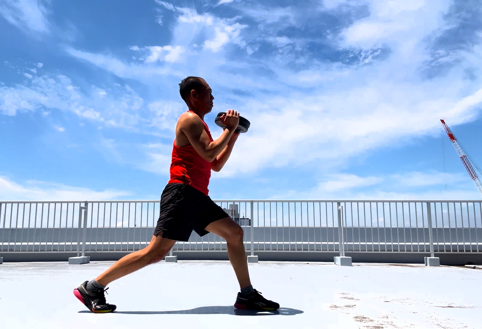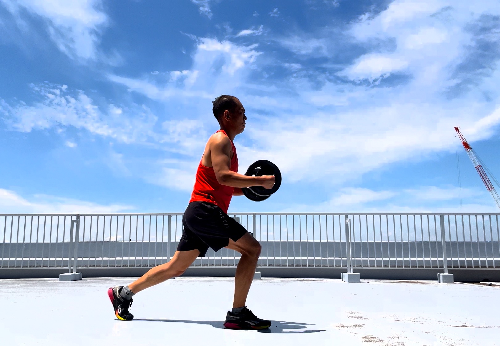 このウォーミングアップ最後は、片手で持ったプレートを重ねて両手で持ちながらの、トリプルパルス・フロントスクワットとバックステップランジを同時に行います。