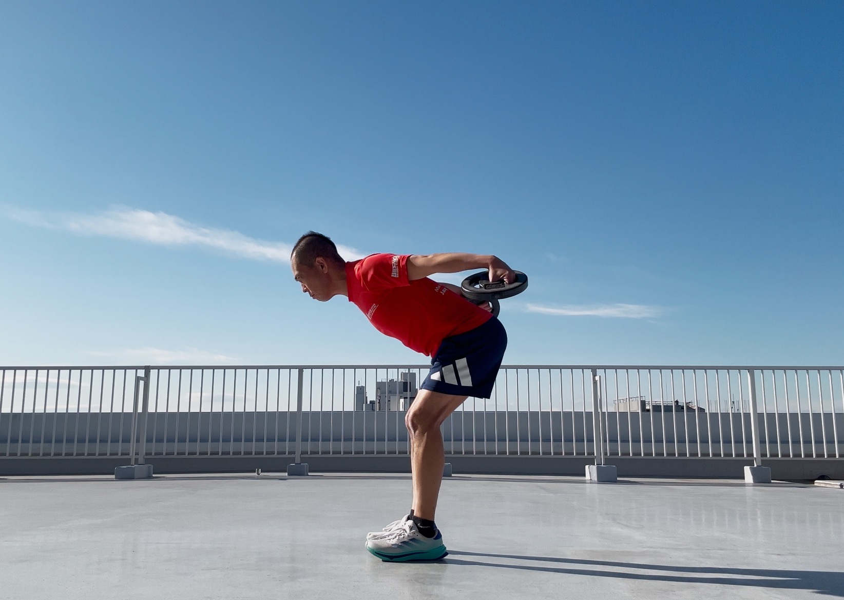 プレートを体側キープで持った状態で、上半身を前傾させたり戻したりの繰り返しで、肩の裏側「三角筋後部」を鍛えます。