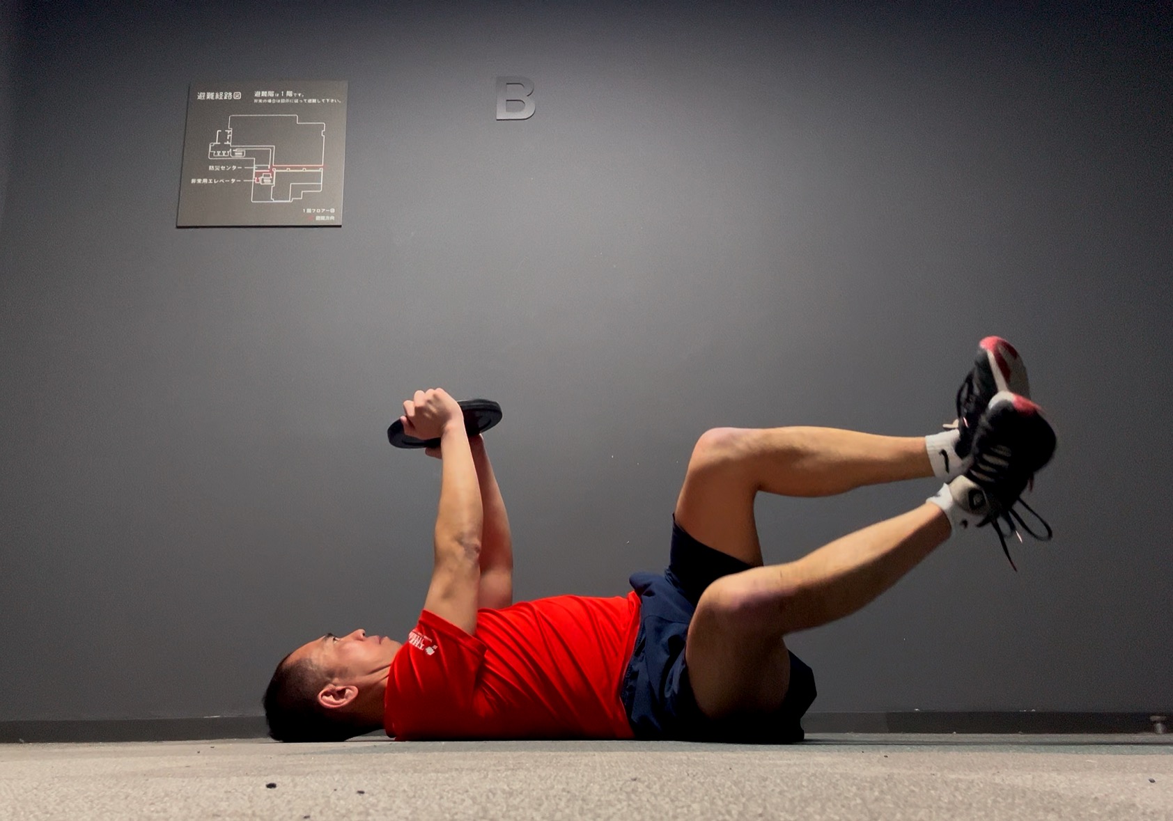 肩の裏側がフロアから離れないように出来るだけ押し当てたままで。