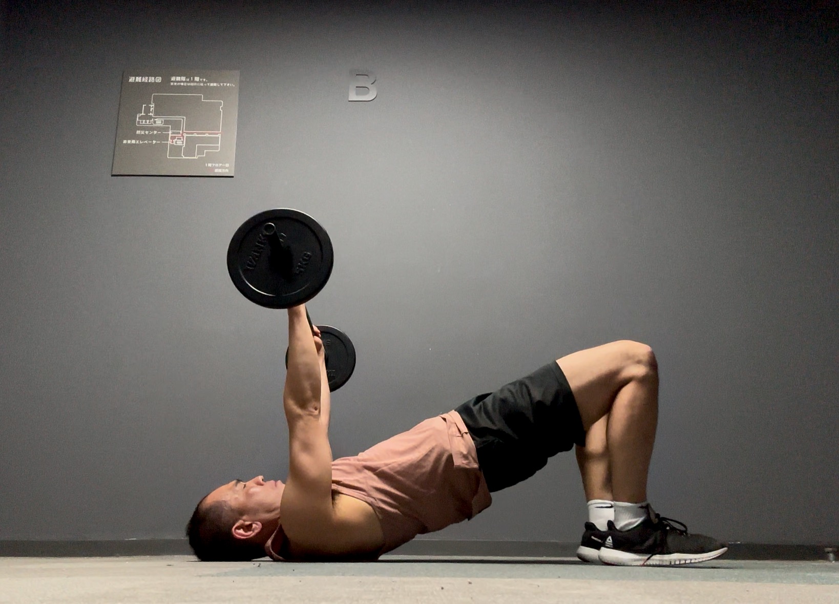 前段的に行うフェーズ1では、フロアに仰向けになりながら、「下から始まるトライセプス・プレス」は↓