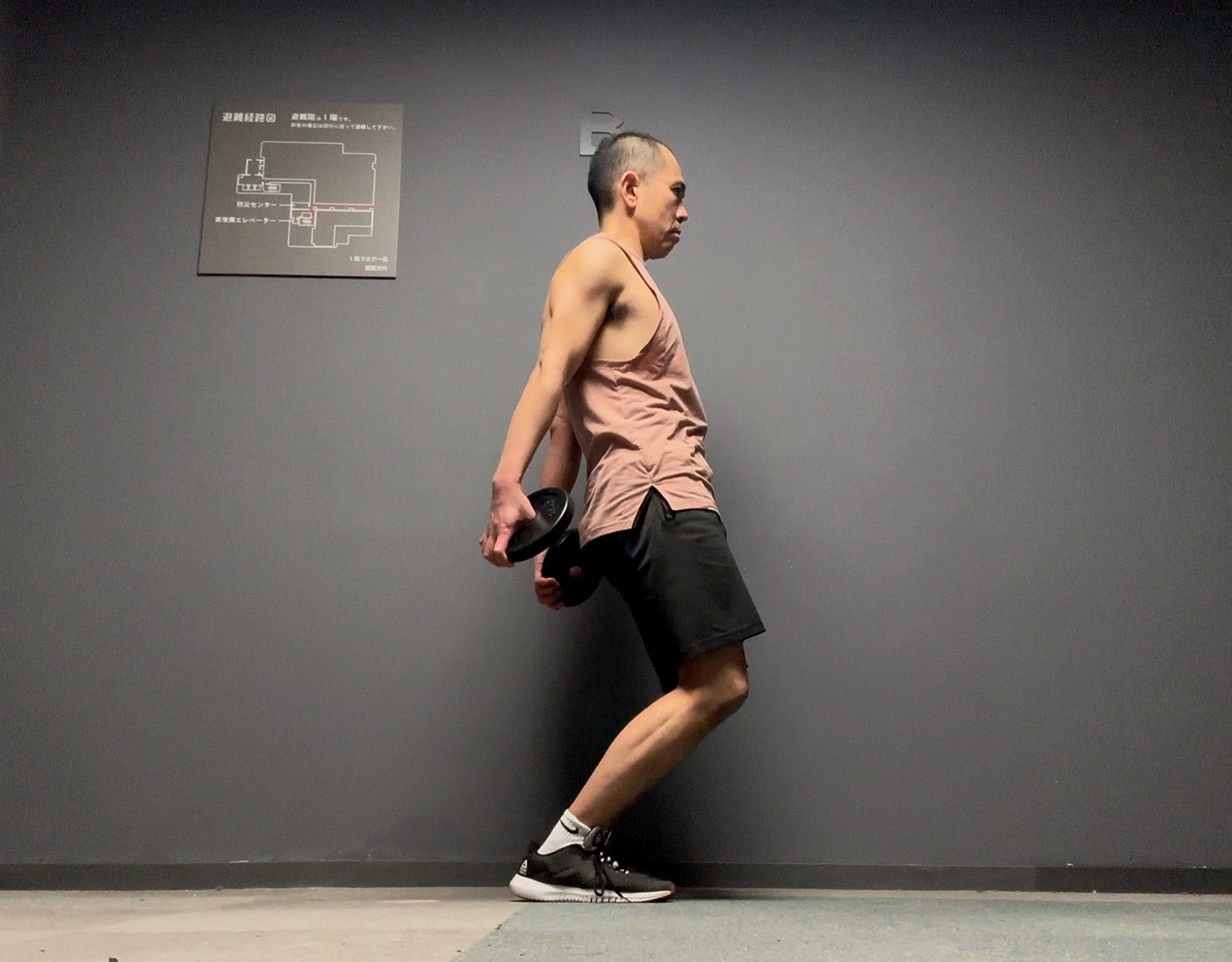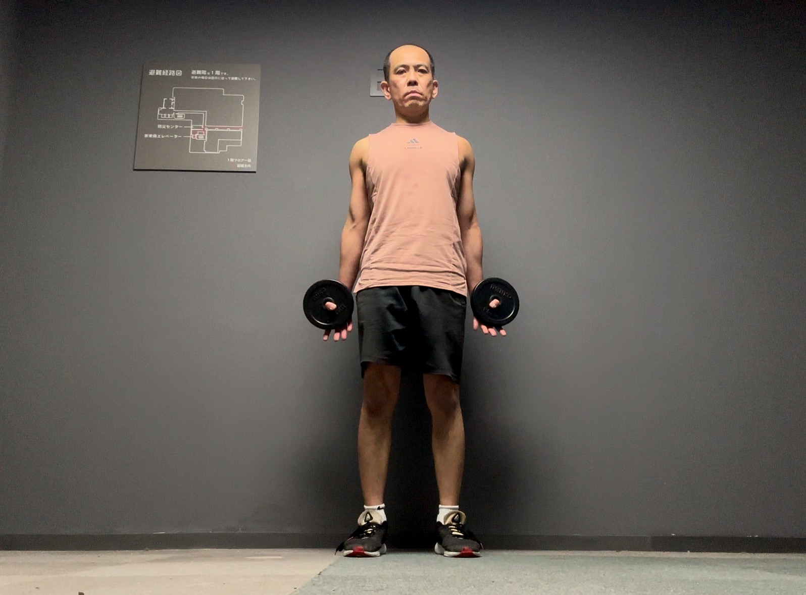 こうすることで、両腕を開いた時に持ったプレートが身体からより遠ざかる形になり、結果的に「三角筋中央部」に掛かる負荷を増すことが可能に。
