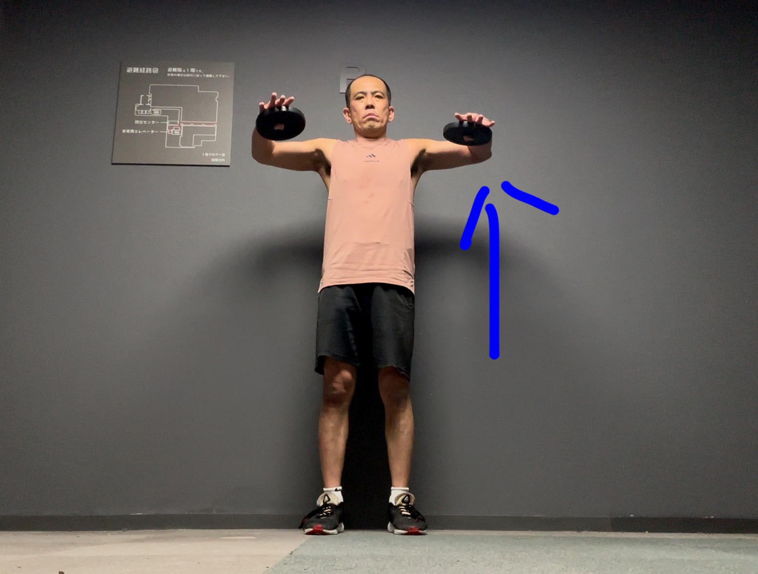前述の通り、通常サイドレイズにしろワイドサイドレイズにしろ、肩の筋肉へしっかり効かせる為の大事なテクニックポイントが↓