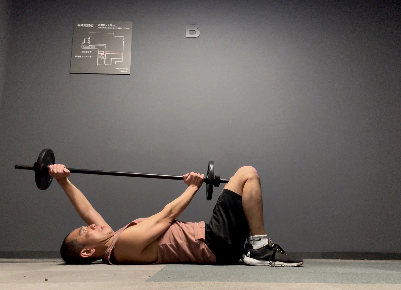 バーベルをベンチプレスの広い幅でキャッチしながら挙上。